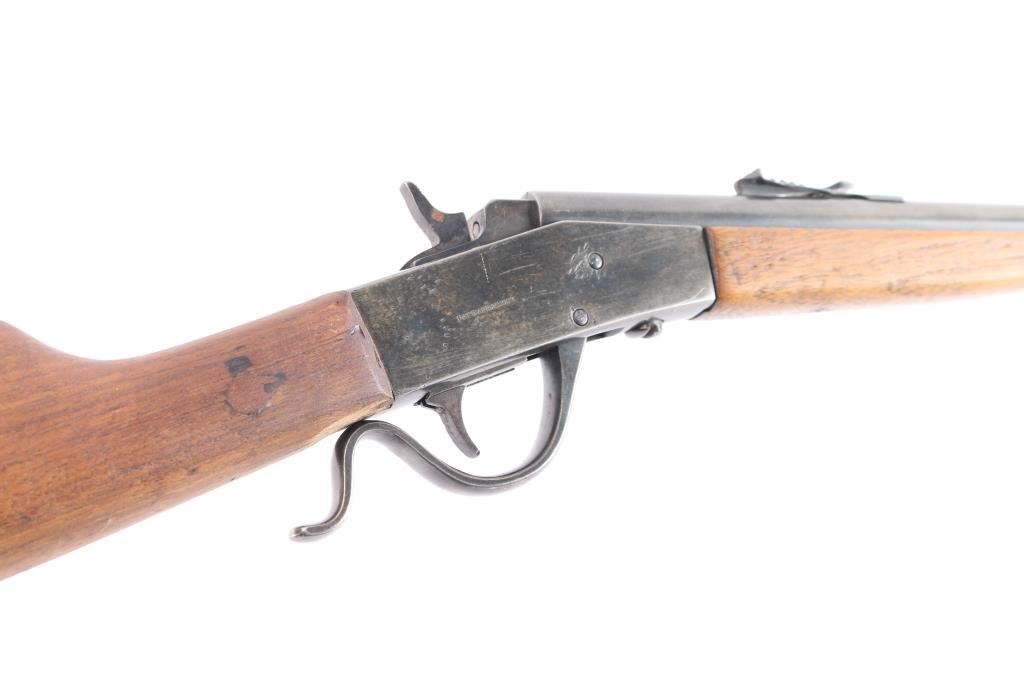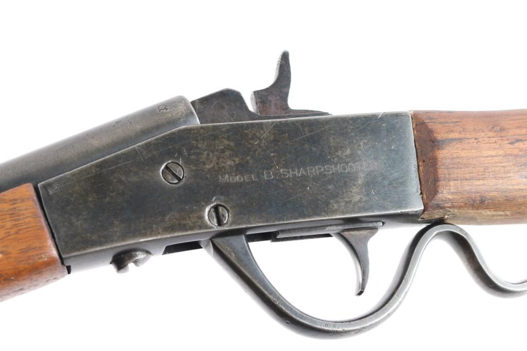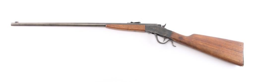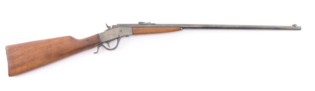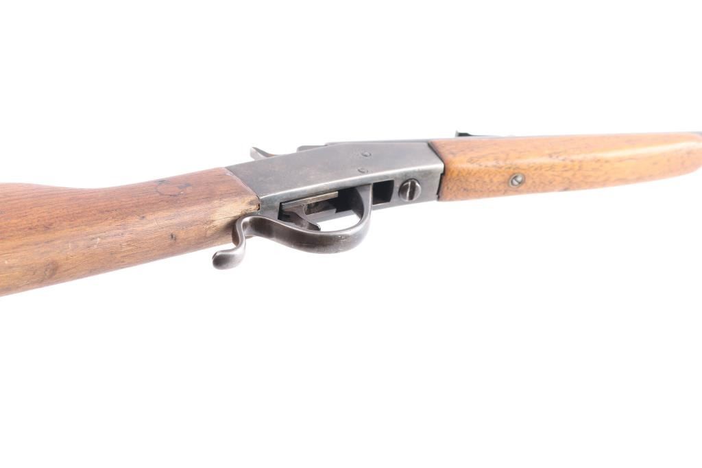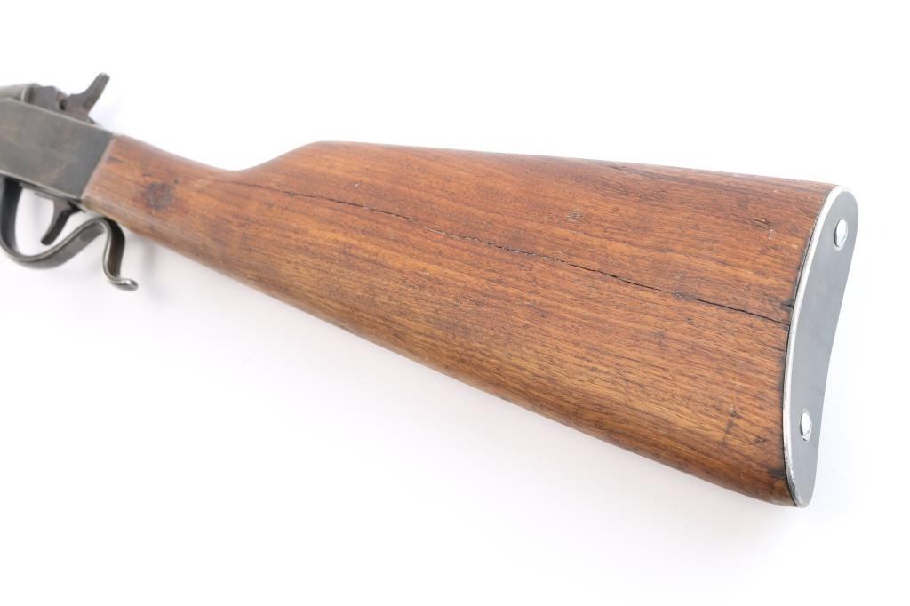 Page Lewis "sharpshooter" 22 L.R. Caliber. Single-shot, falling Block Boys Rifle. NSNV. The front sight has been "upgraded" with copper insert added and bead. Gray to brown patina with good metal. Butt stock broken and shows old repair and stocks fair to poor only. Action good and bore good. Missing tang screw. Manufactured between 1920 and 1926.
