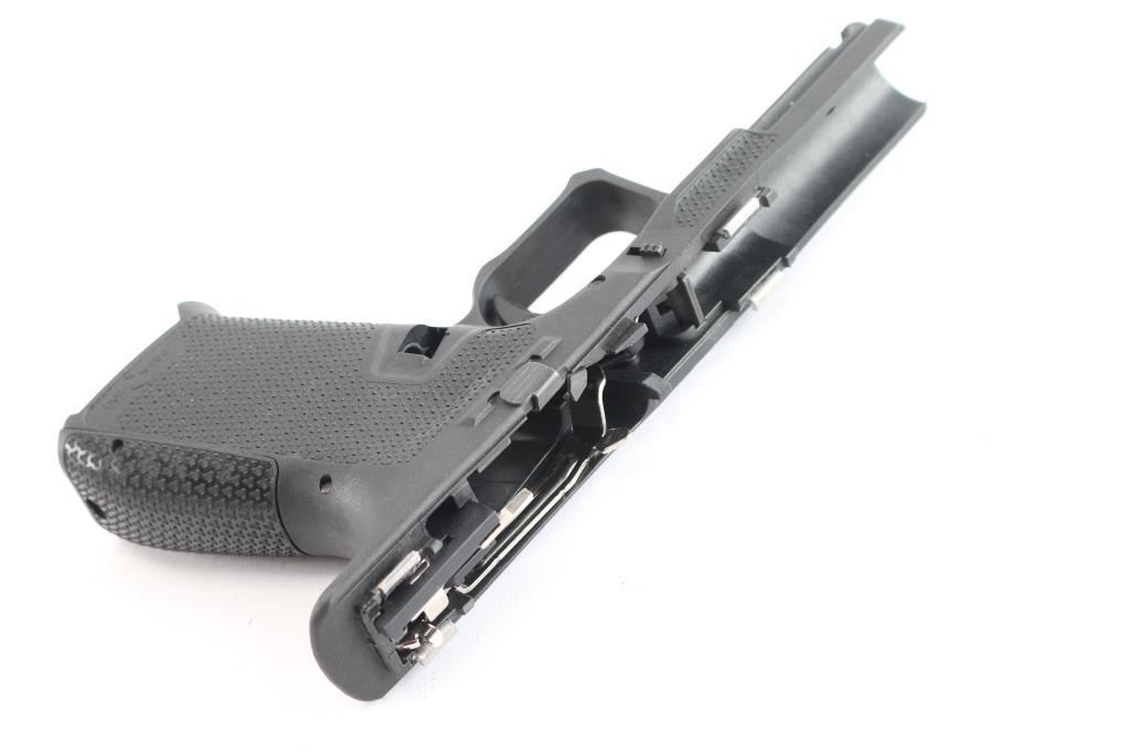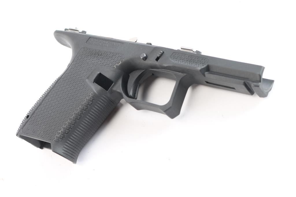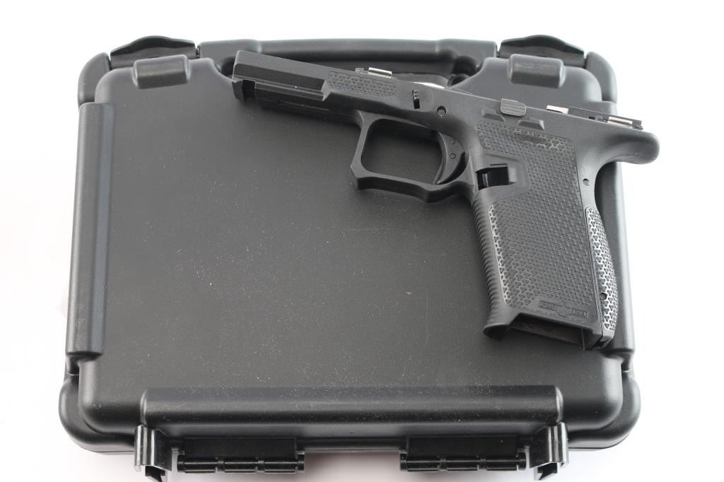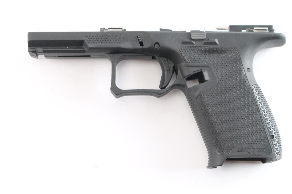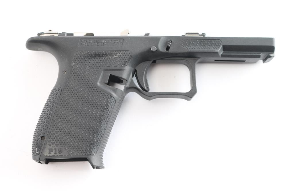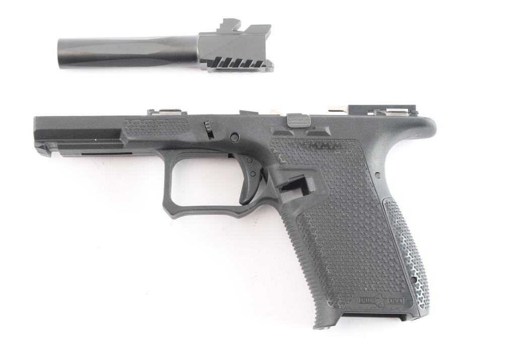 Patriot Ordnance Factory P19 Gen 4 Enhanced Glock compatible Frame. Features Flared Magwell, Contoured Grip, Interchangeable Backstrap Sizes, Accessible Mag Release, Grip Texture, Slide Stop Guard, Extended Beaver Tail. Enlarged Cold Weather Triggerguard, Forward Thumb Ledges. Single Locking Block Pin. Comes in factory hard case with matching label, two backstrap inserts and a Airsurplus 3 3/4"9mm serrated Glock barrel, new in packaging.