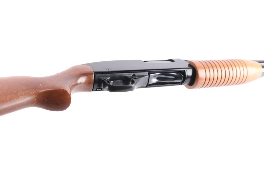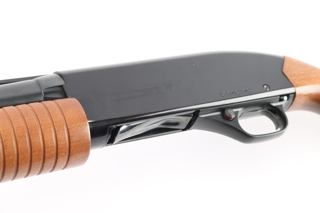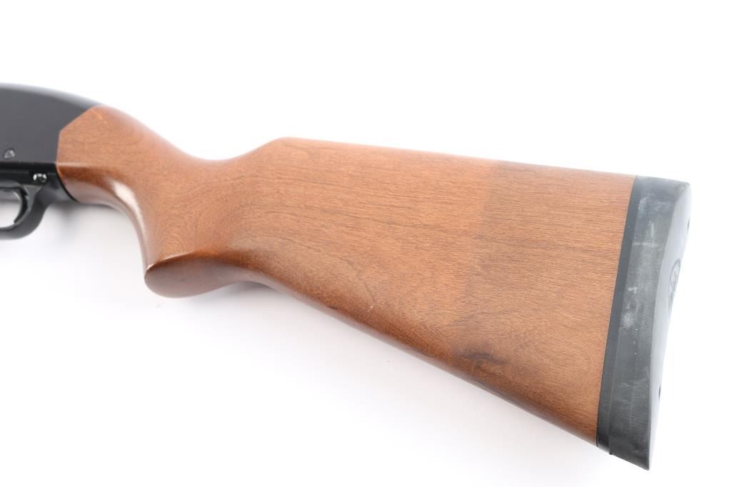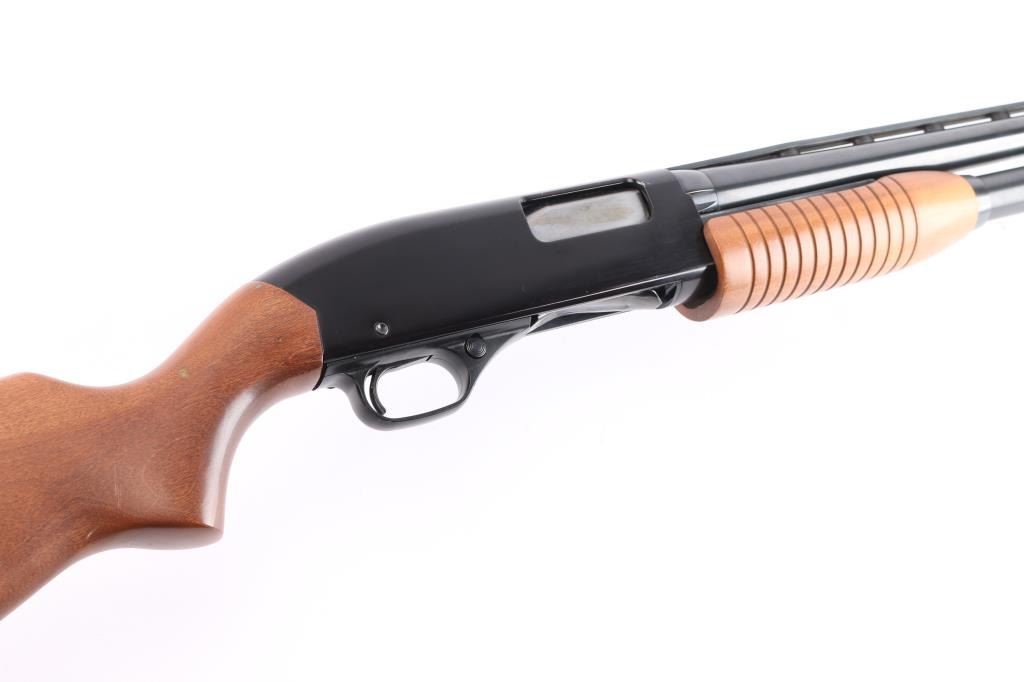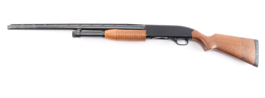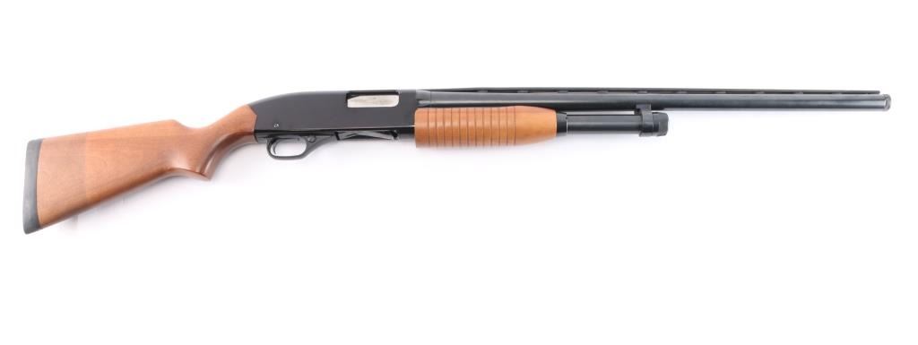 'Ranger' Slide action shotgun chambered for 2 3/4" & 3" 12 gauge shells. Features a blued 24" barrel with ventilated sighting rib & removable modified choke, brass bead front sight, four round tube magazine, smooth trigger, alloy trigger guard with cross-bolt safety, black finished alloy receiver with serrated top strap, dual action bars, grooved hardwood slide handle and semi-pistol grip shoulder stock with factory recoil pad & 13" LOP. Shotgun retains approximately 98% of its original finish showing minor scratches. Action is smooth, the bore is excellent and the wood stocks are excellent with minor blemishes. Manufactured 1978-2006.