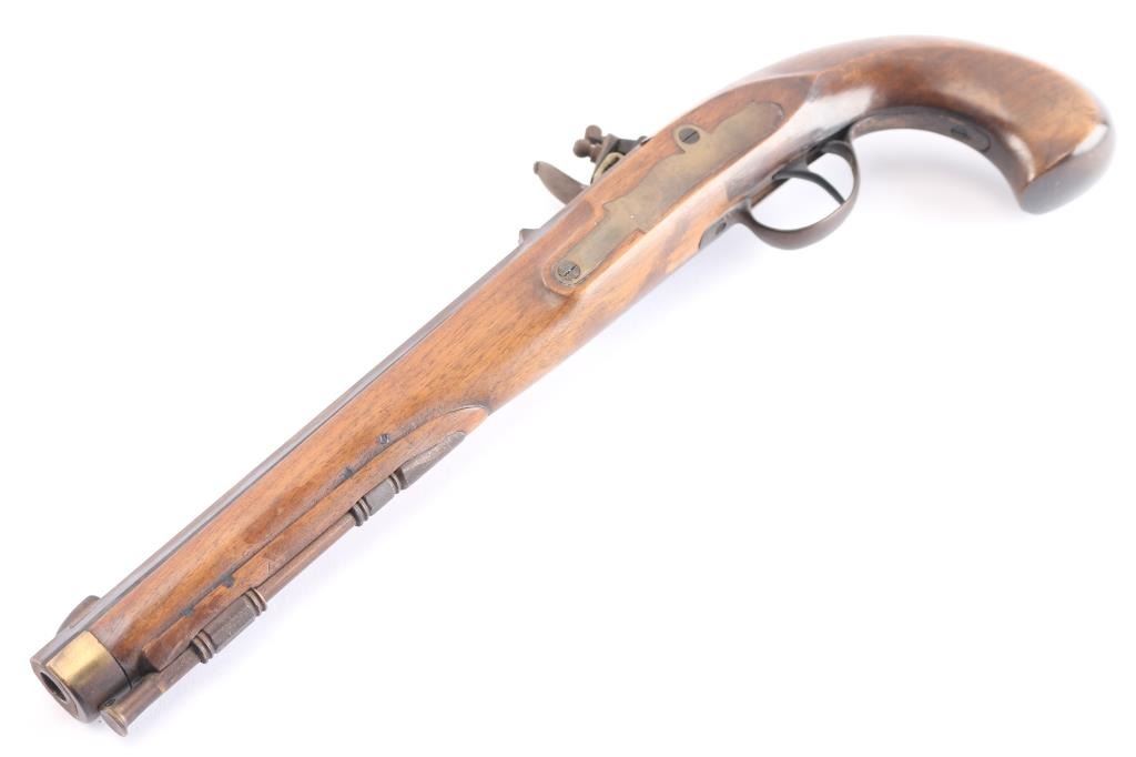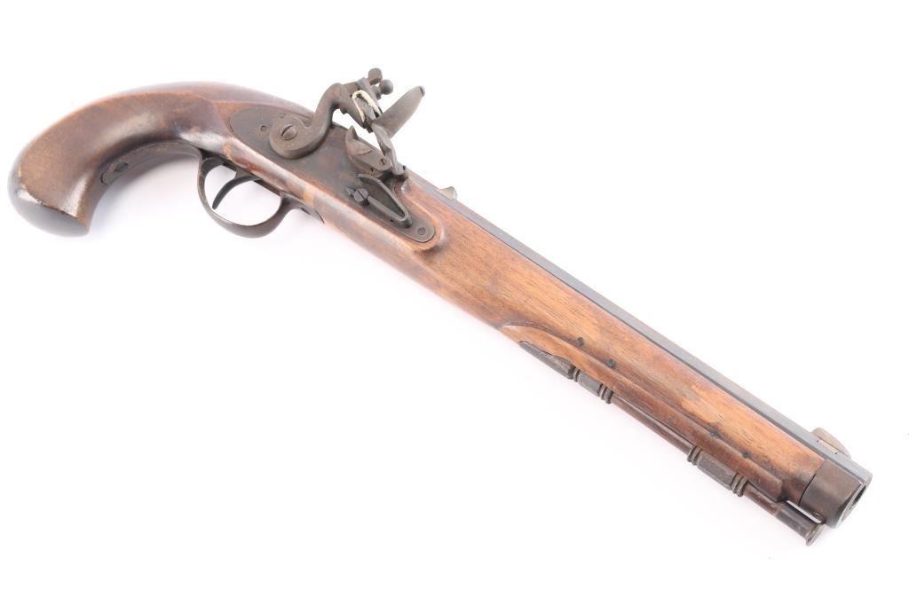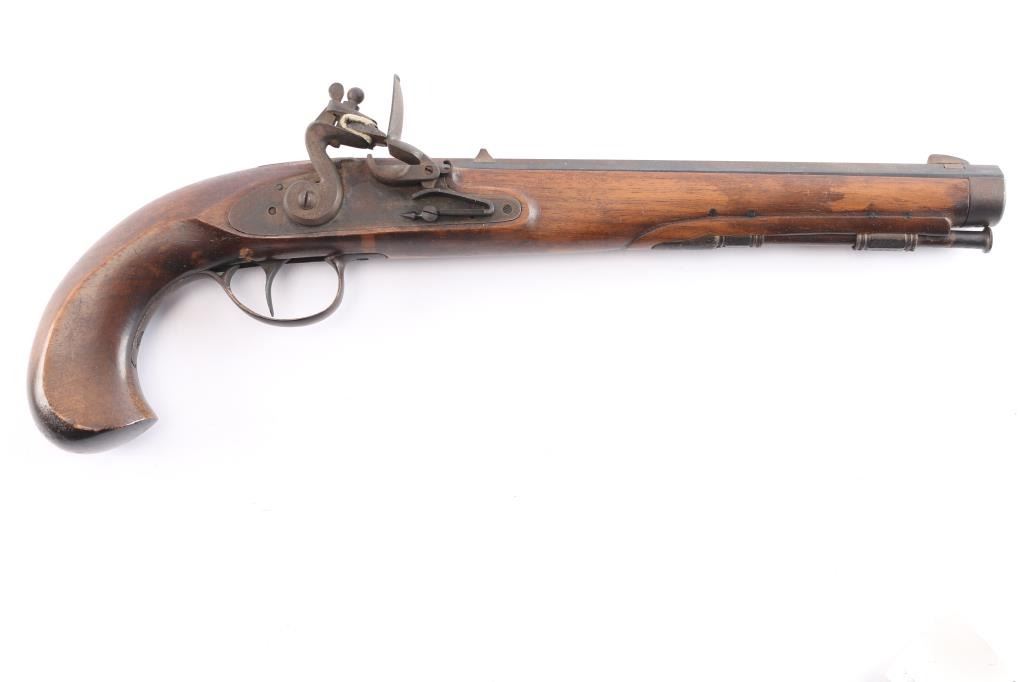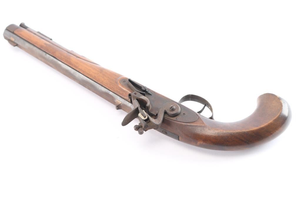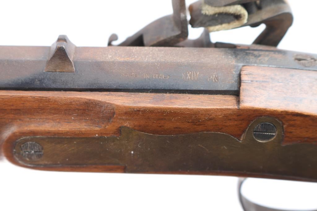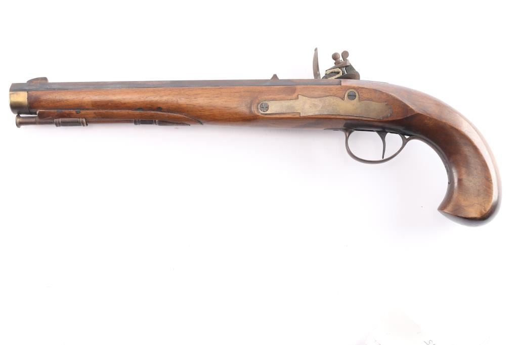 SN: 2375. Italian made copy of the Kentucky flintlock pistol. Manufactured 1968. Features a heavy 10 1/4" octagonal barrel, blade front, u notch rear sights, brass plated fittings, wooden ramrod with brass tip. Stock is overall good/sound with some minor scratches/dings, some handling loss to the finish, two click hammer action works well, the top of the barrel is covered with a brown patina and the rifled bore is very good, a little dirty.