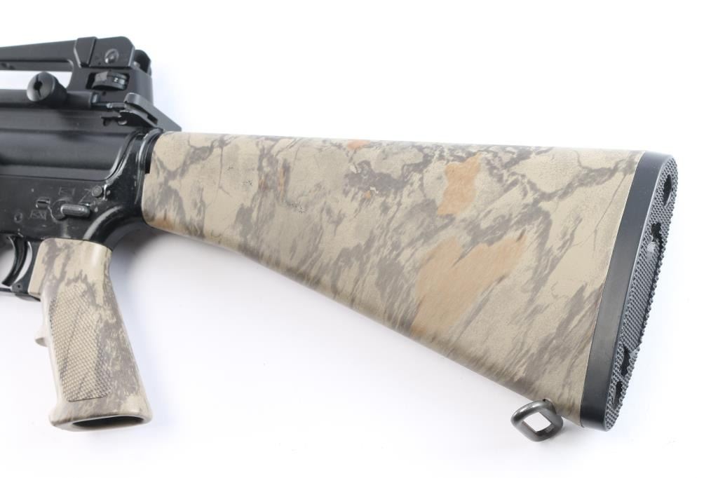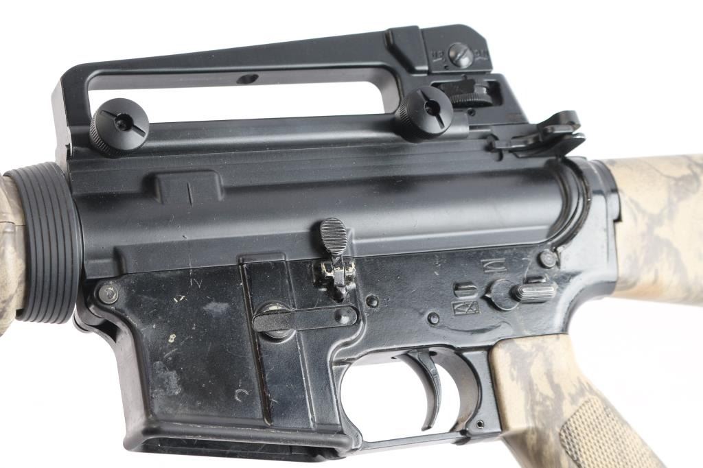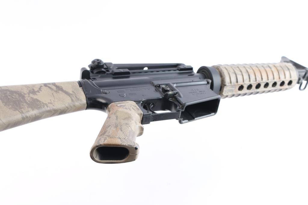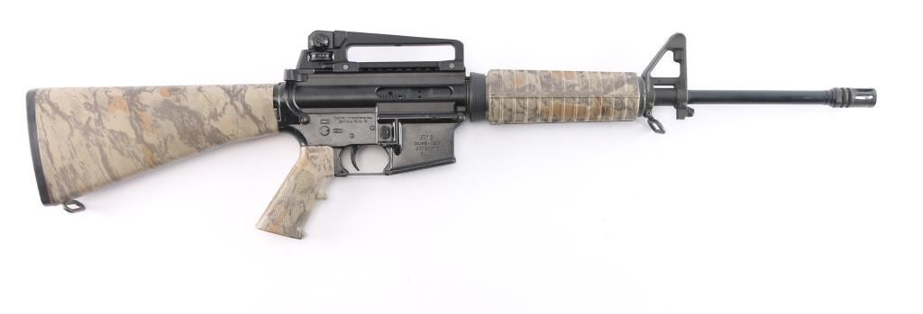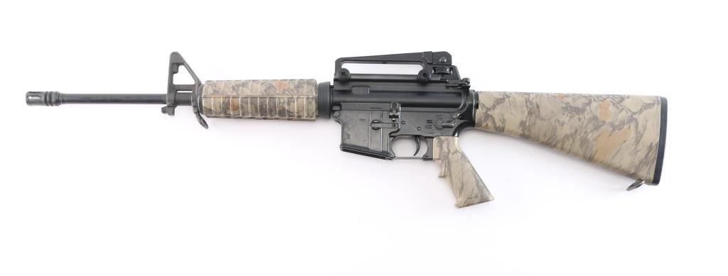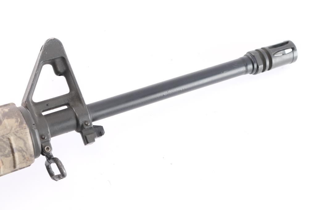 Semi-automatic AR-15 rifle chambered in 5.56 NATO. Features a black anodized upper receiver and a black painted lower, a DTI 16" pencil profile barrel with a 1/9 twist, A2 front sight post w/bayonet lug, A2 flash hider and carry handle rear sight, standard charging handle, thumb safety, bolt release button, push button magazine release and sling swivels. The flattop upper has no ejection port cover or brass deflector. Tan Woodland camo style carbine forend, A2 grip, and A2 shoulder stock w/storage compartment. Bore is very good/slightly dirty, Retains approx. 90% finish w/scrapes, scratches and edge losses. Stock and forend have no visible losses or marks. NRA condition is good to very good. ***Modern Firearm***