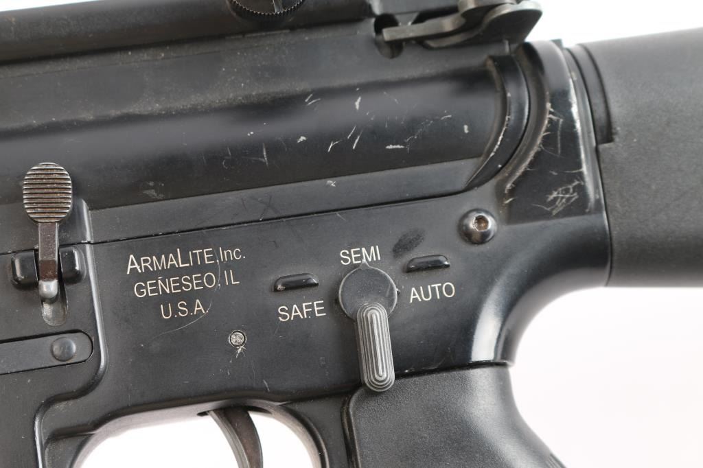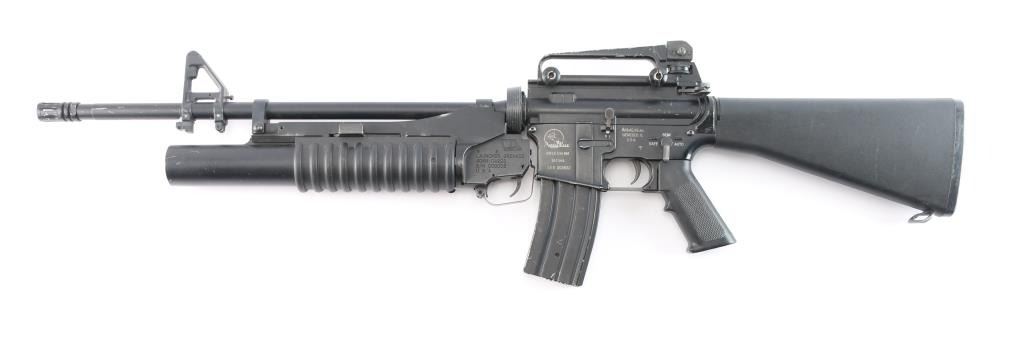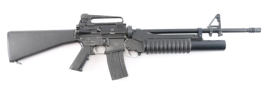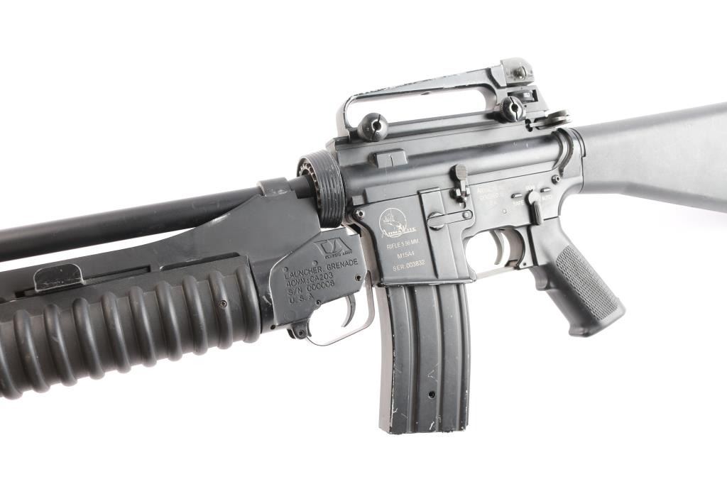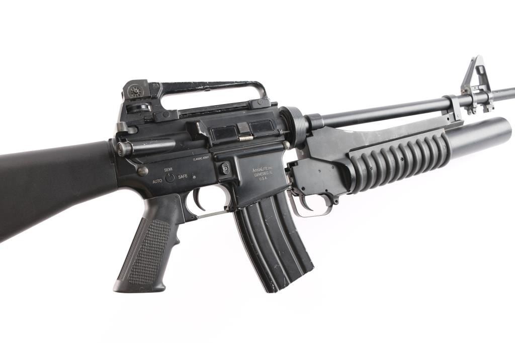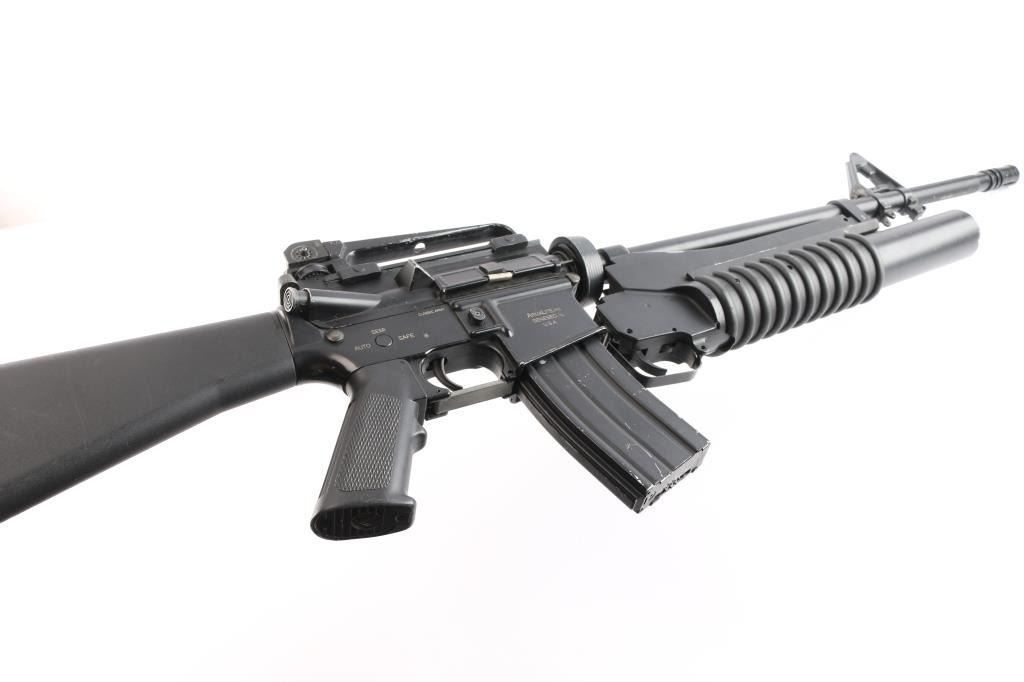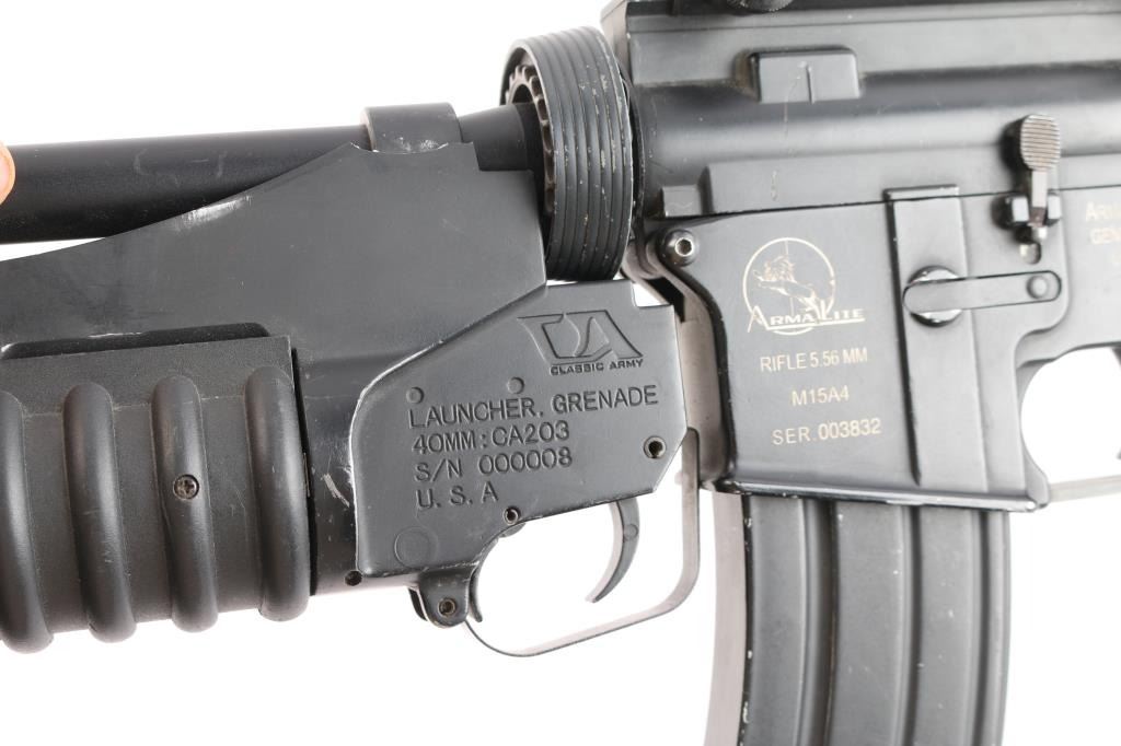Classic Army Licensed ArmaLite M15A4 Airsoft Carbine. A2 style buttstock sights and grip, detachable carrying handle, muzzle break. Classic Army m203 style 40mm grenade launcher attached, airsoft magazine. No handguards, the rear ring on the launched to attach to barrel is broken. Unknown if it is in working order, no battery. SN:003832.