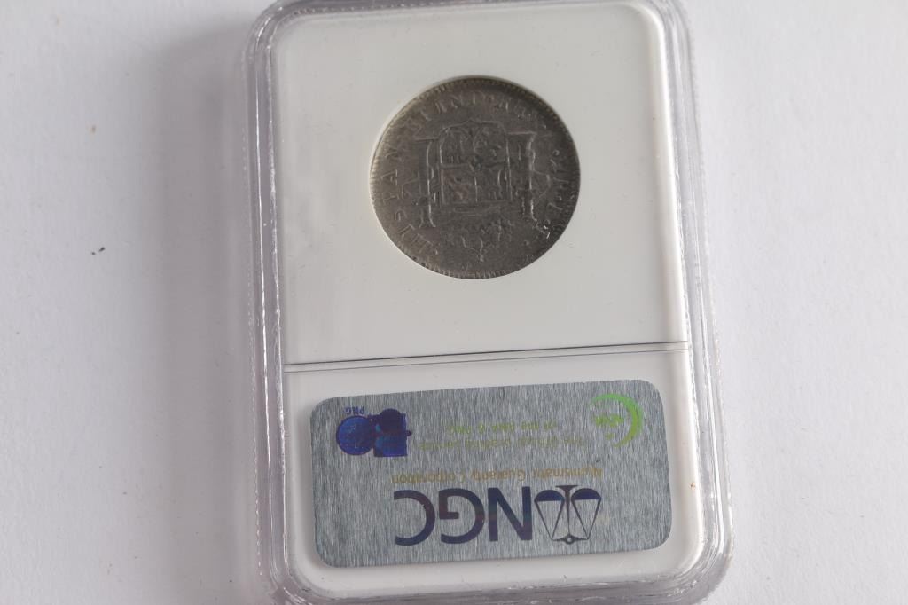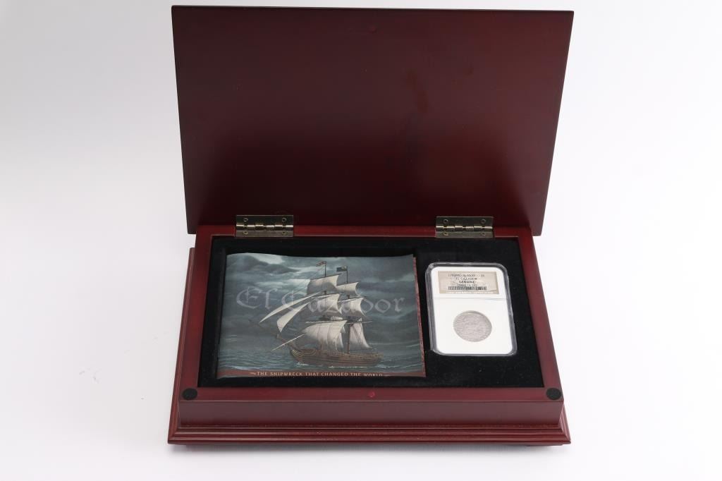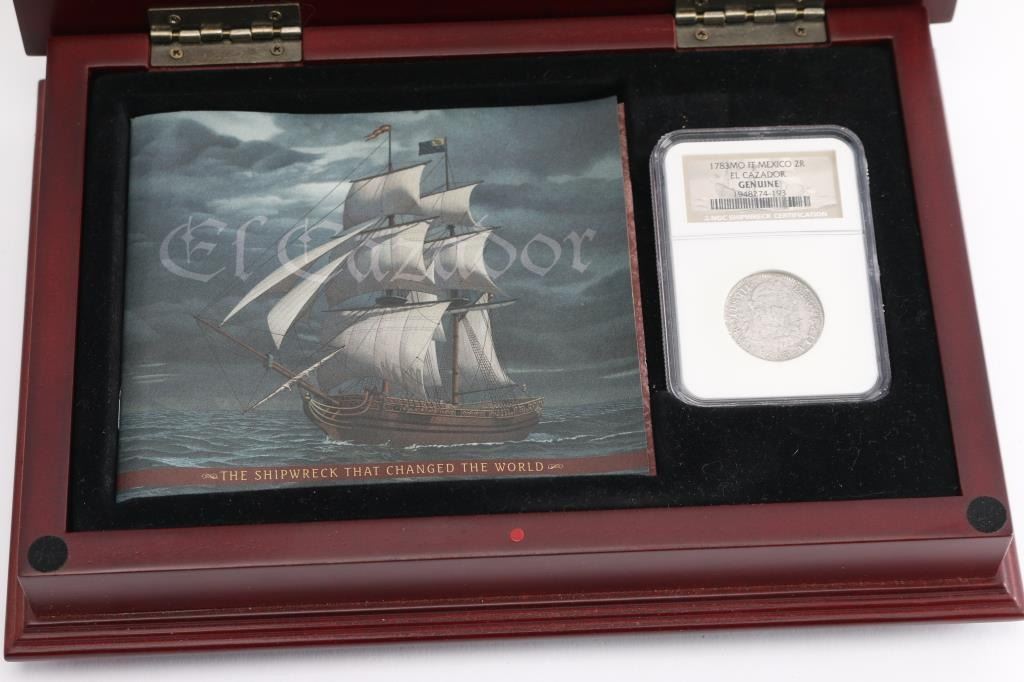 El Cazador was a Spanish brig that sank in 1784 with 450,000 silver coins on board. The shipwreck was discovered in 1993 and the coins are now administered by the Franklin Mint. This is a Silver Spanish Colonial 2R Genuine EL CAZADOR shipwreck coin with NGC Shipwreck Certification. With original box and paperwork. Box measures 2" tall by 10 1/2" by 7".