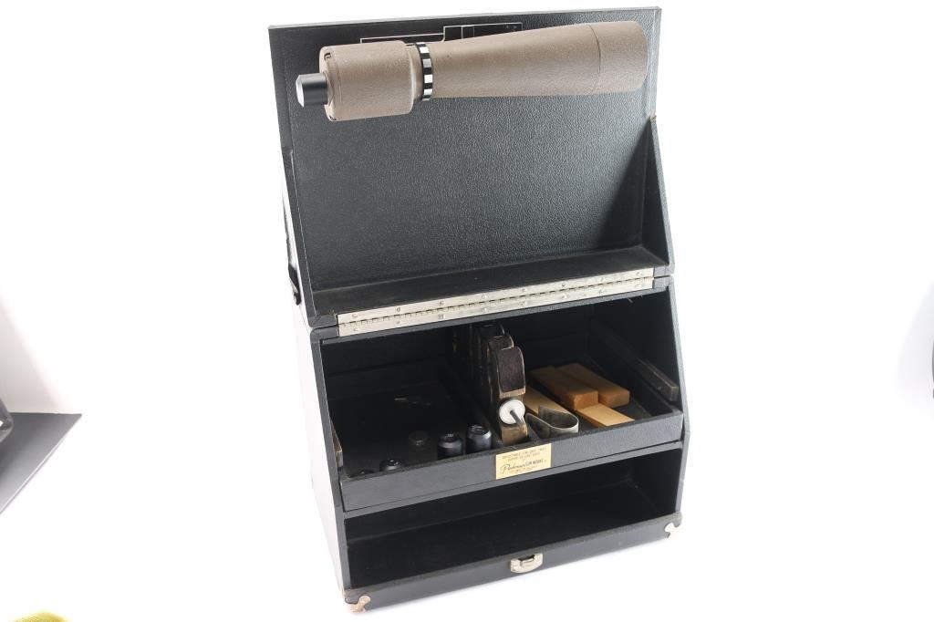 Vintage, high quality locking range box has large hinged lid with spotting scope, multiple different eyepieces for different magnification, slide out drawer with clamping system for secure transport of handguns, smaller lid on reverse side. In good condition.