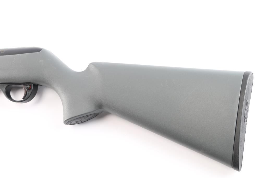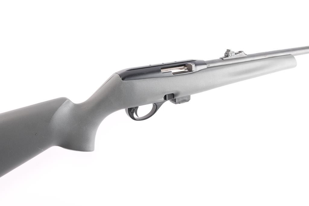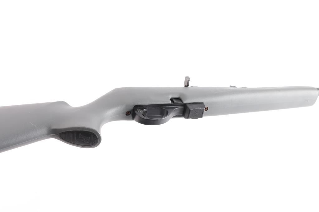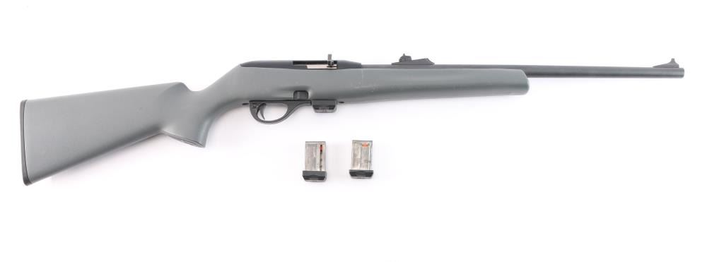 Semi-automatic rimfire rifle features a matte black finish, 20" barrel, ramped blade front sight with white dot, adjustable sliding rear sight, drilled & tapped receiver with integral scope rail cuts, push button safety, sling studs, green synthetic pistol grip shoulder stock, factory buttplate Bore is excellent/bright. Overall condition is like new. Manufactured 2007.Comes with three 10 rd magazines.