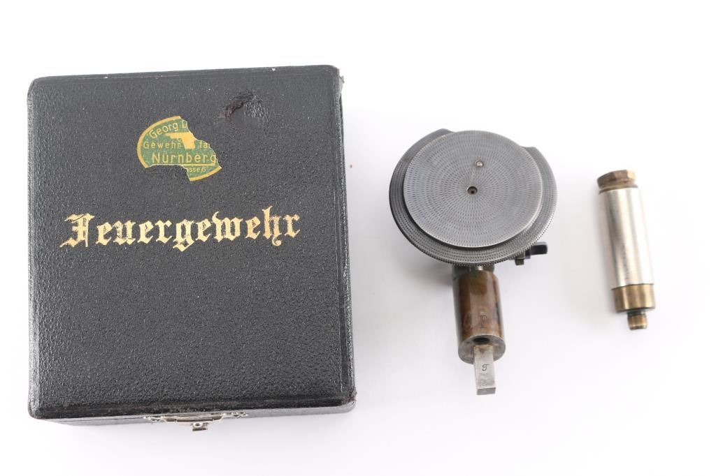 To magnify the object aimed at. In origianl box with partial label, George Lechner, Nurnberg. Original box is green velvet lined and labeled "Feuergemehr".