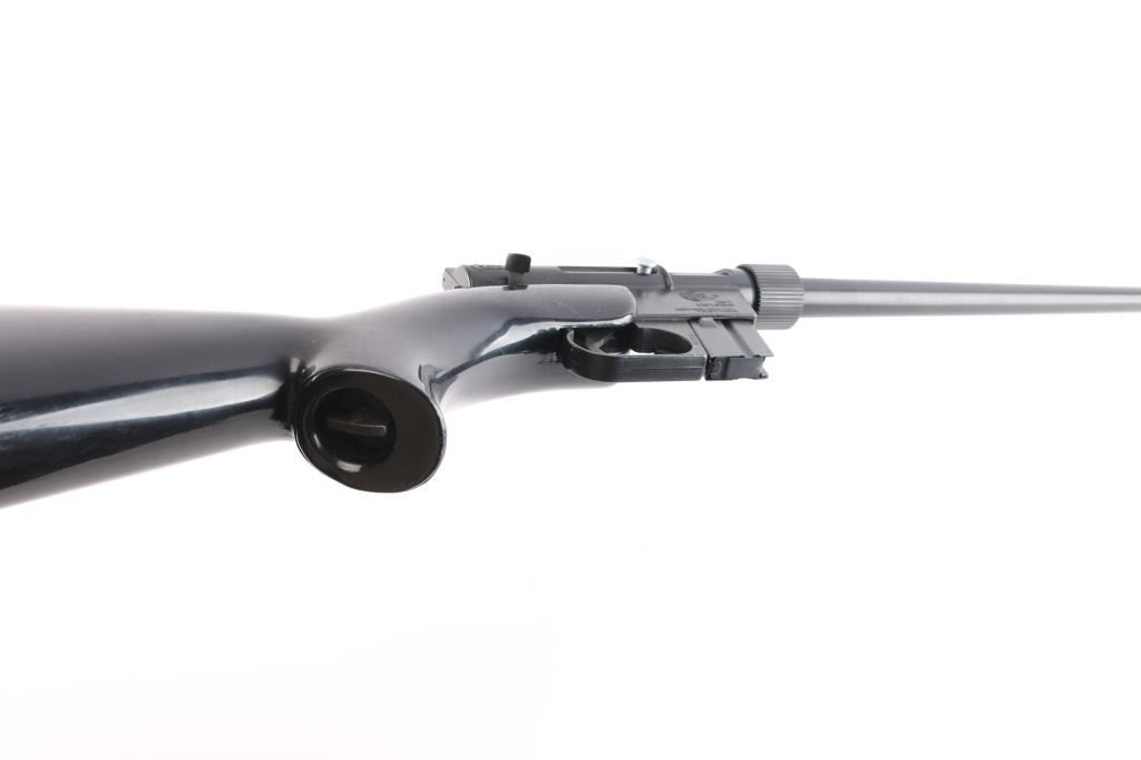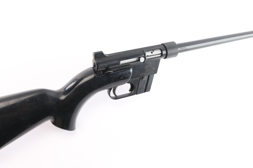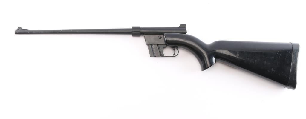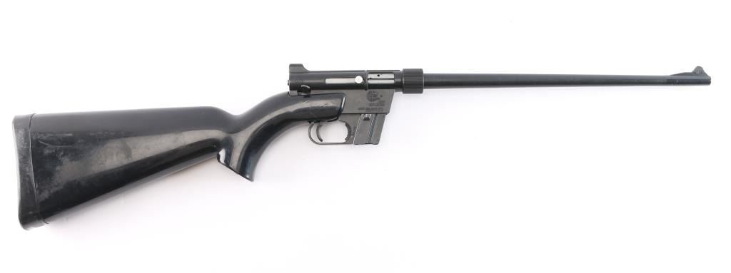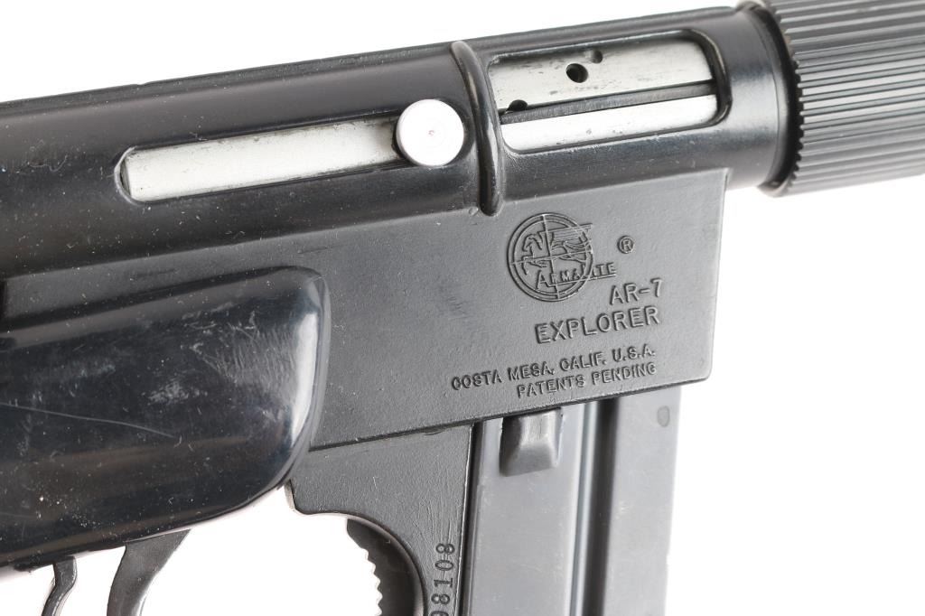 Lightweight & portable take-down semi-automatic rimfire rifle chambered in .22 Long Rifle. Manufactured in Costa Mesa, CA circa 1959-1973. The AR-7 was designed at Armalite by Eugene Stoner, intended for civilian sales as a semi-automatic variant of the AR-5 bolt action rifle that was adopted by the U.S. Air Force. Features a satin black finish, steel lined 16” tapered barrel, dovetailed blade front sight with red painted accent, elevation adjustable rear aperture sight, serrated curved trigger, concealed hammer, two-position thumb safety on the right side of the receiver, detachable 8 round magazine, retractable charging handle and black synthetic buttstock which all of the components of the rifle fit inside when taken down. The buttstock cover is marked “Charter Arms”. Rifle retains approximately 95% of its original finish showing scattered scratches and small losses. The action is mechanically sound, the bore is very good and the plastic stock is good with numerous scratches & scuffs.