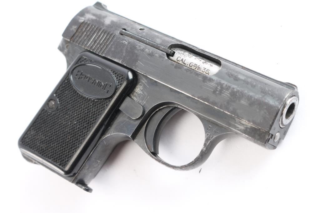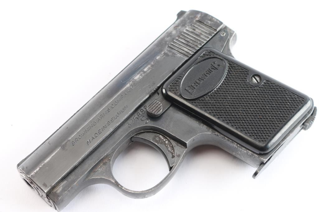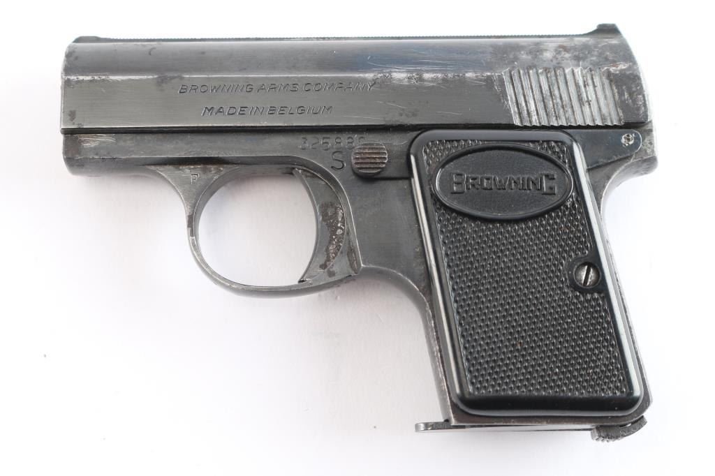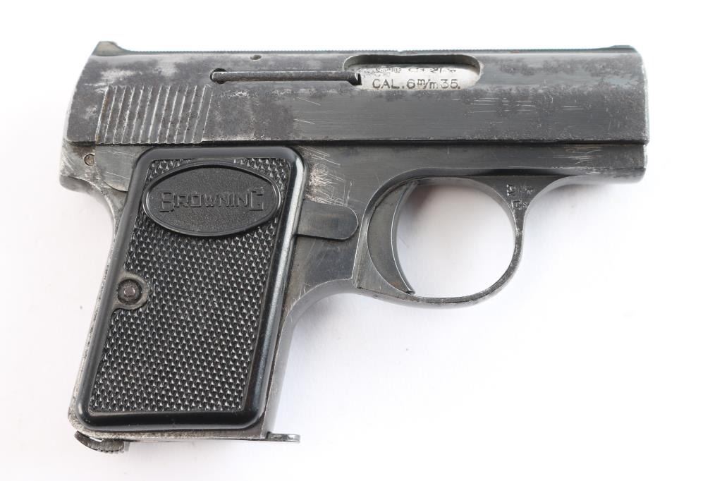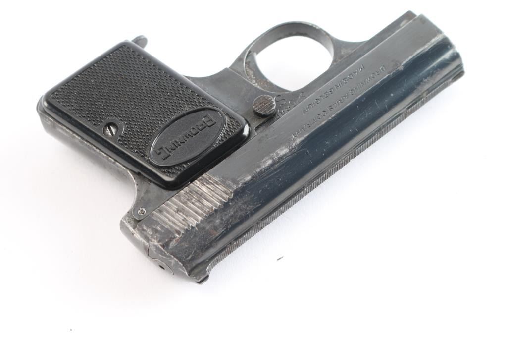 Belgium made striker-fired semi-automatic pocket pistol chambered in .25 Auto. Manufactured circa 1965. Features a blued finish, 2" barrel, fixed sights, smooth trigger, cocked indicator on the rear of the slide, thumb safety on the left side of the frame, magazine disconnect safety, heel magazine release, 6 round magazine, and two-piece checkered black plastic grips with Browning motifs. Pistol retains approximately 75% of its original finish showing edge wear, scratches, and scattered pitting/rust. The action is sound, the bore is bright with sharp rifling & minor pitting forward of the chamber, and the synthetic grips are very good.