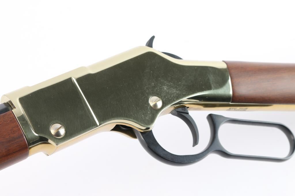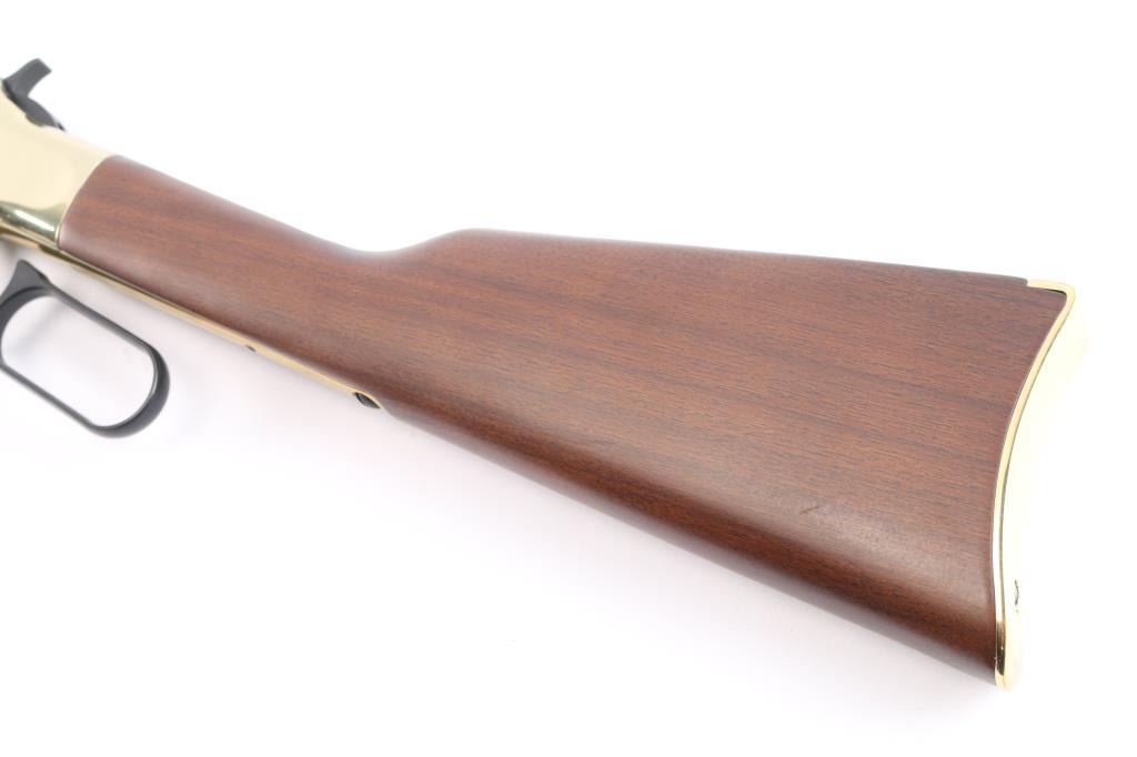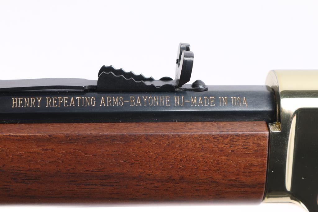 American made lever action rimfire carbine features blued finish, yellow brass color plated action (receiver, link, lower tang, barrel band.), walnut forend & stock, checkered panels at wrist & forend, brass plated crescent buttplate, 20" octagonal barrel, full length magazine tube under barrel, dovetailed buckhorn sights with blade/bead front. Barrel markings gold toned, Bayonne, NJ address. Bore is very good. Overall condition is like new with few signs of handling. Wood is excellent.
