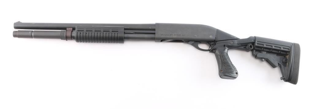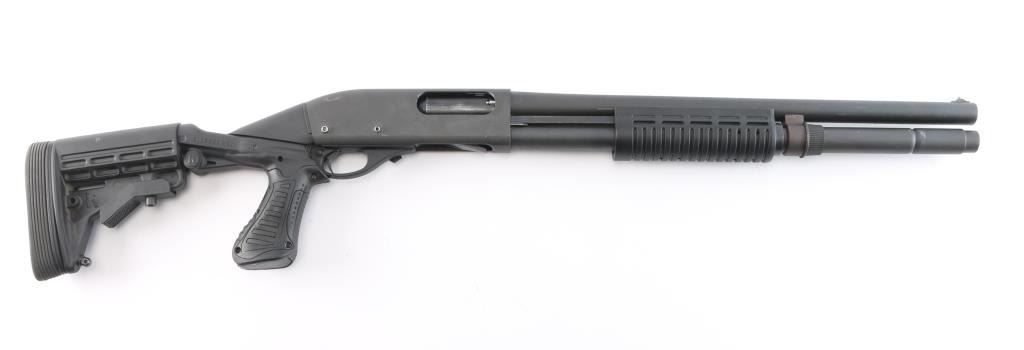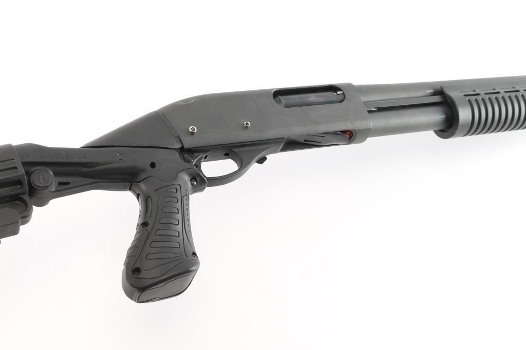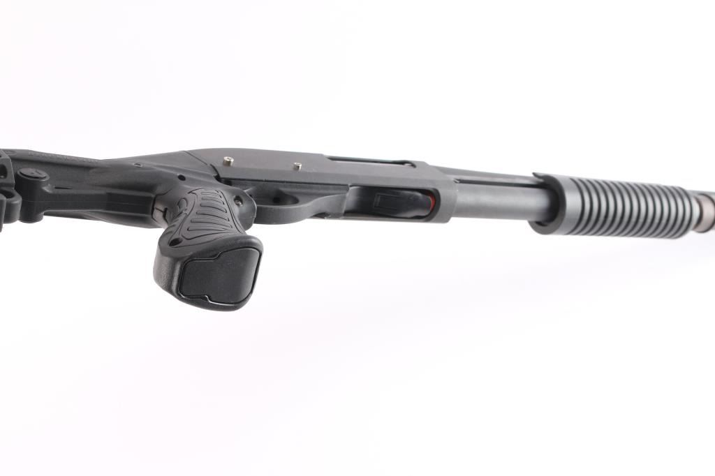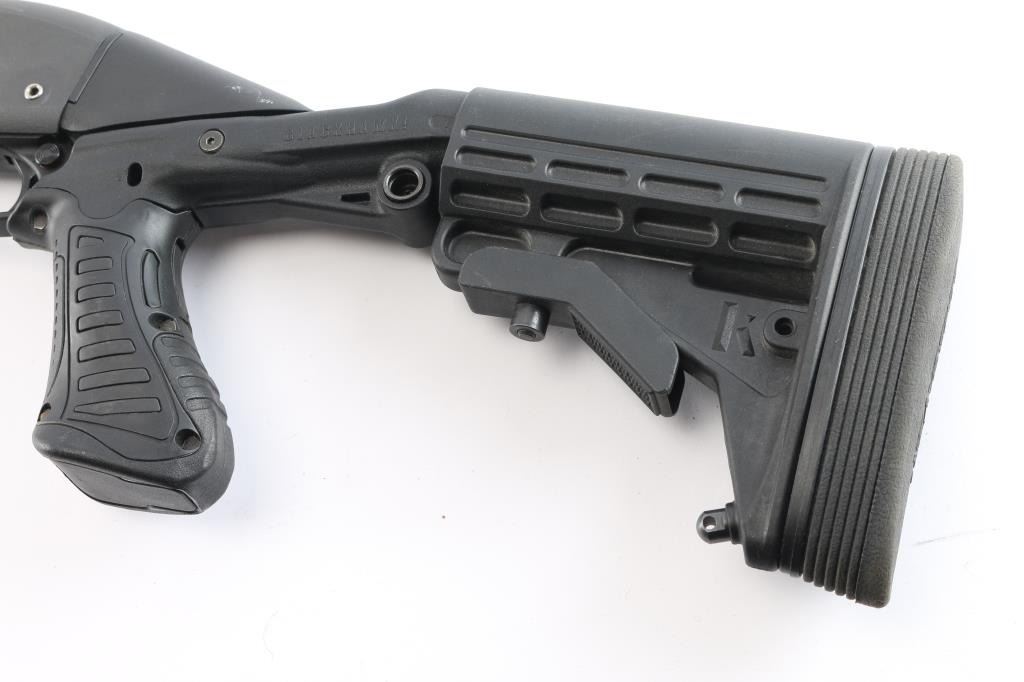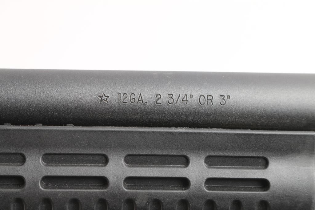 Modern pump action 12ga shotgun chambered for 2 3/4" & 3" shells. Fixed cylinder choke. The 18.5" barrel and receiver have a matte black finish with a synthetic stock, forend,. Raised silver bead front sight. The finish on both barrel and receiver are very good with only minor handling marks. The bore is very good. Blackhawk recoil suppression rear stock with 7 position adjustments, recoil pad and QD ports. Shell carrier pins are in place of trigger group pins.