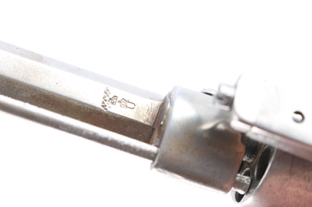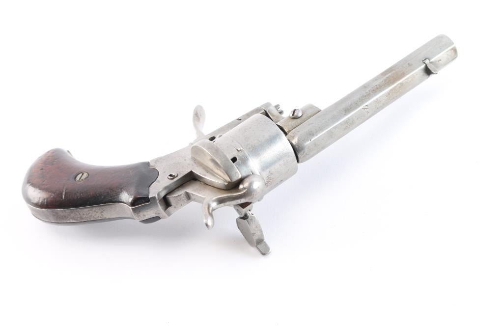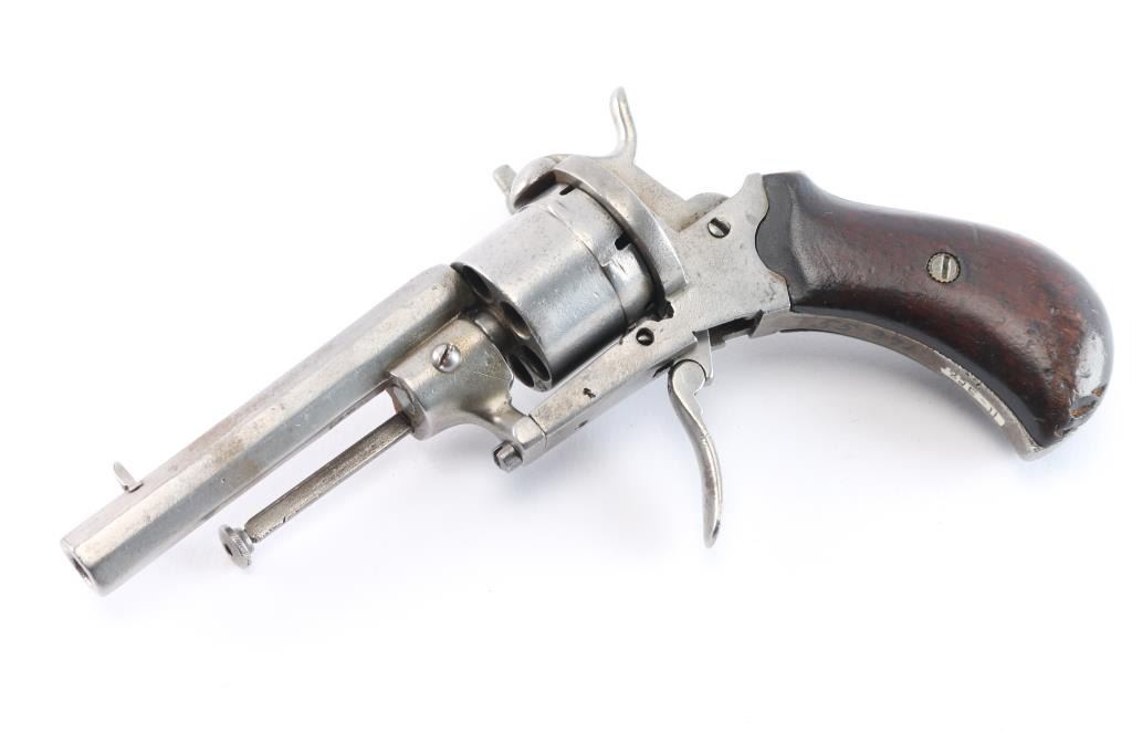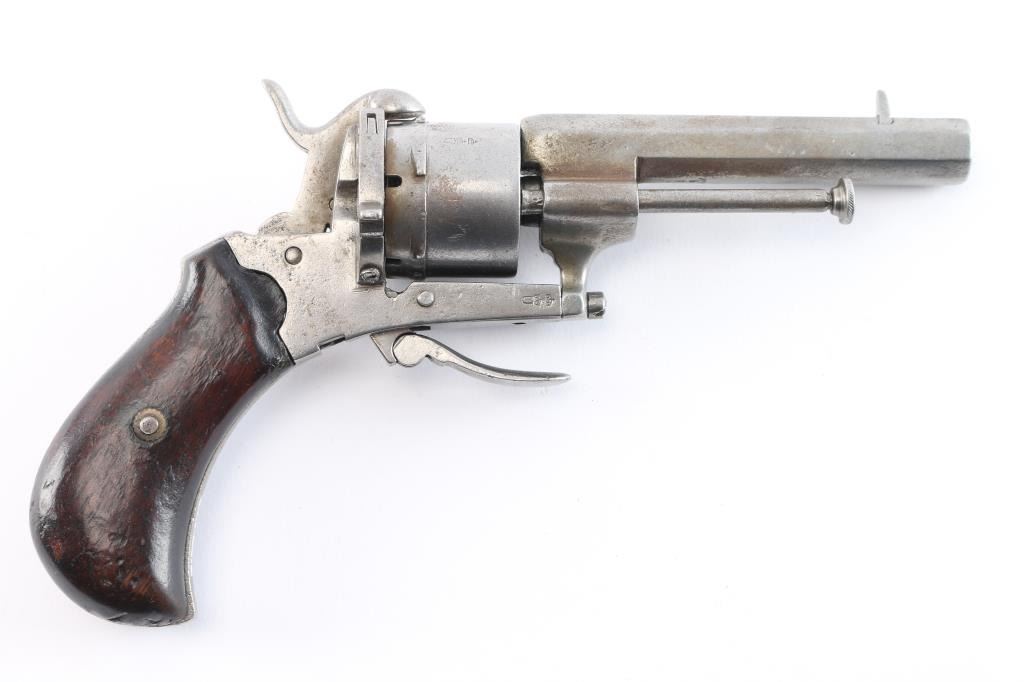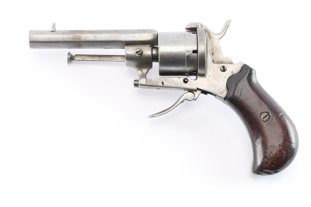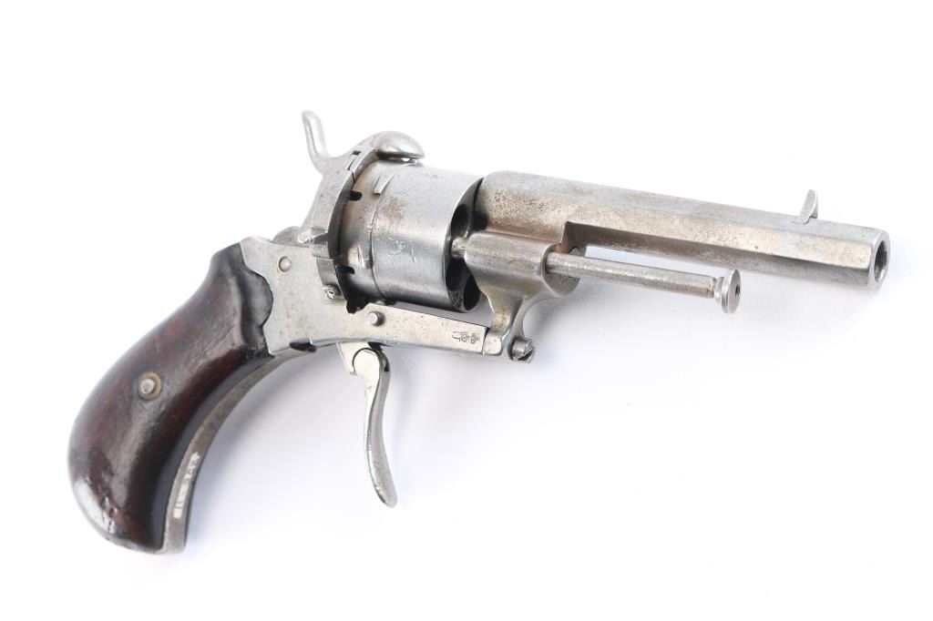7mm Pinfire. 3 3/8" octagonal barrel .German pinfire revolver produced by an unknown manufacturer. Double crown/U proof is stamped on the cylinder, barrel and frame. Metal components are in the white, with the frame being mounted with 2 piece smooth wood grips, manual ejector, folding trigger, hinged loading gate and unfluted 6-shot cylinder. Assembly batch number "25" matched on cylinder face and frame under the left grip. Metal components exhibit some scattered areas of very mild pitting overall, Grips show some minor marks from storage and handling, but are otherwise very good overall. The trigger works intermittently firing single-action, needs adjustment. The bore is ok, light scattered pitting.