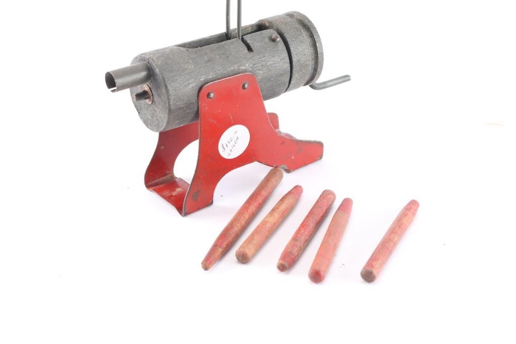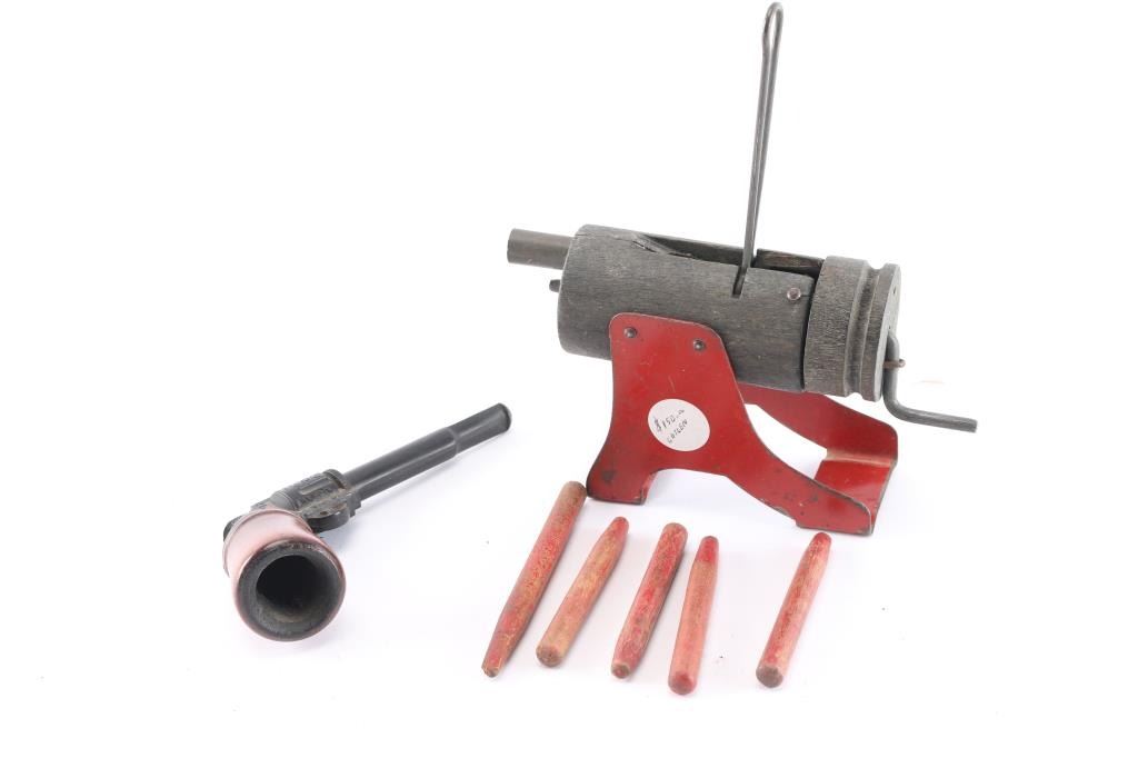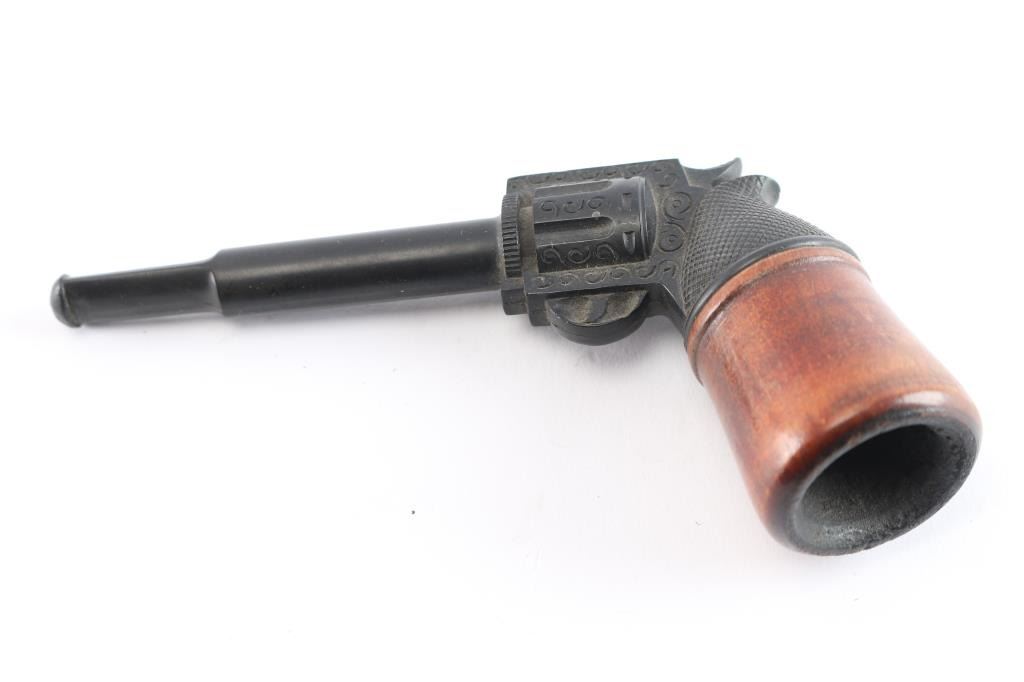 Gutta percha with wood bowl smoking pipe circa 19th century. 5 1/2" from tip to bowl. Good condition. Simulates an engraved revolver. And a metal and wood "Gatling gun" top shooting pencil size wood projectile and spring driven (not working, ATF deactivated?) 3 1/2" height by approximately 6" length. Vintage antique.