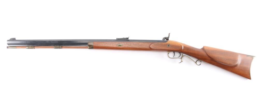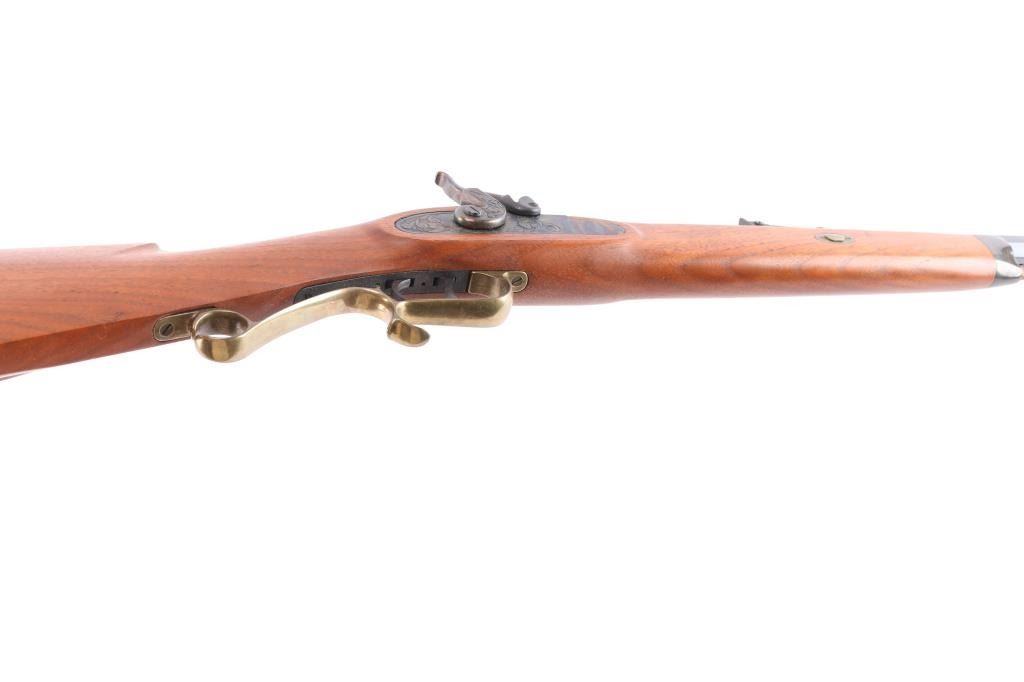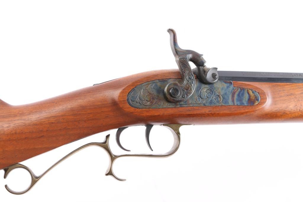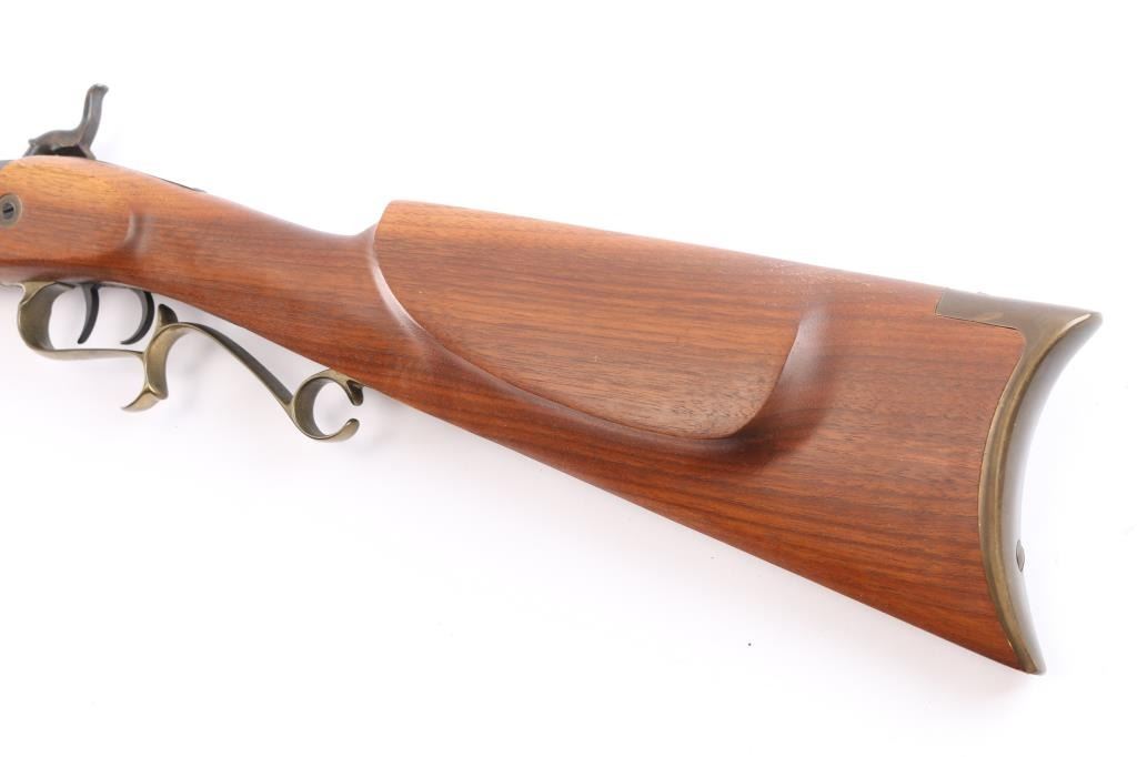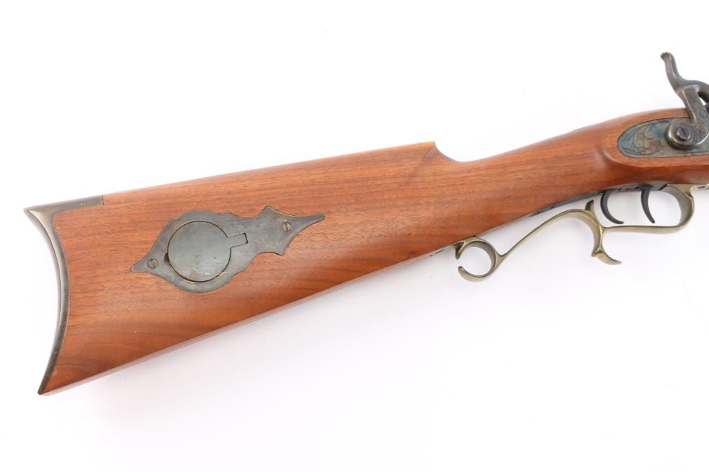 Single shot muzzle loading percussion plains rifle uses Black Powder (or Pyrodex or similar powder) only. Features blued 28" octagon barrel, blade/bead front & adjustable u notch rear sight, wood ramrod under barrel, half stock with brass plated fittings, crescent buttplate, patch box, double set triggers, case colored lock. Rifle appears unfired, in like new condition with few handling marks, rifled bore is excellent, dusty. Comes with manual/paperwork.
