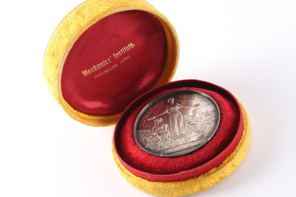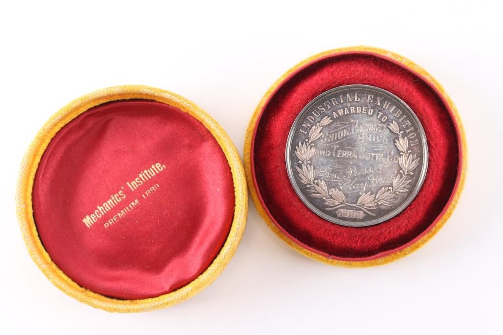 Reads: Industrial Exhibition awarded to Union Pressed Brick and Terra Cotta CO Best Pressed Clay Brick 1889 appears to be sterling coin in original velvet lined display box.