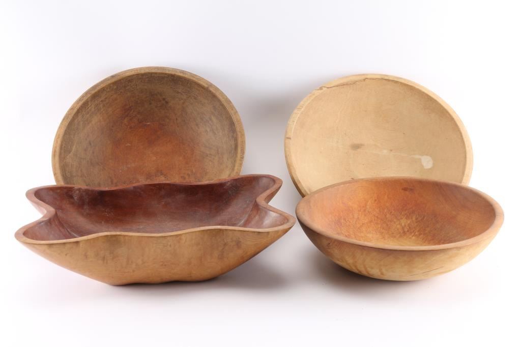 One bowl measuring 12" diameter and 3 1/4" tall; one bowl measures 13" diameter and 3 1/2" tall; one measures 13" diameter by 3 3/4" tall; and one is shaped in a wiggly pattern measuring 16" long by 4" tall by 10" wide. All show some to quite a lot of wear or use inside..