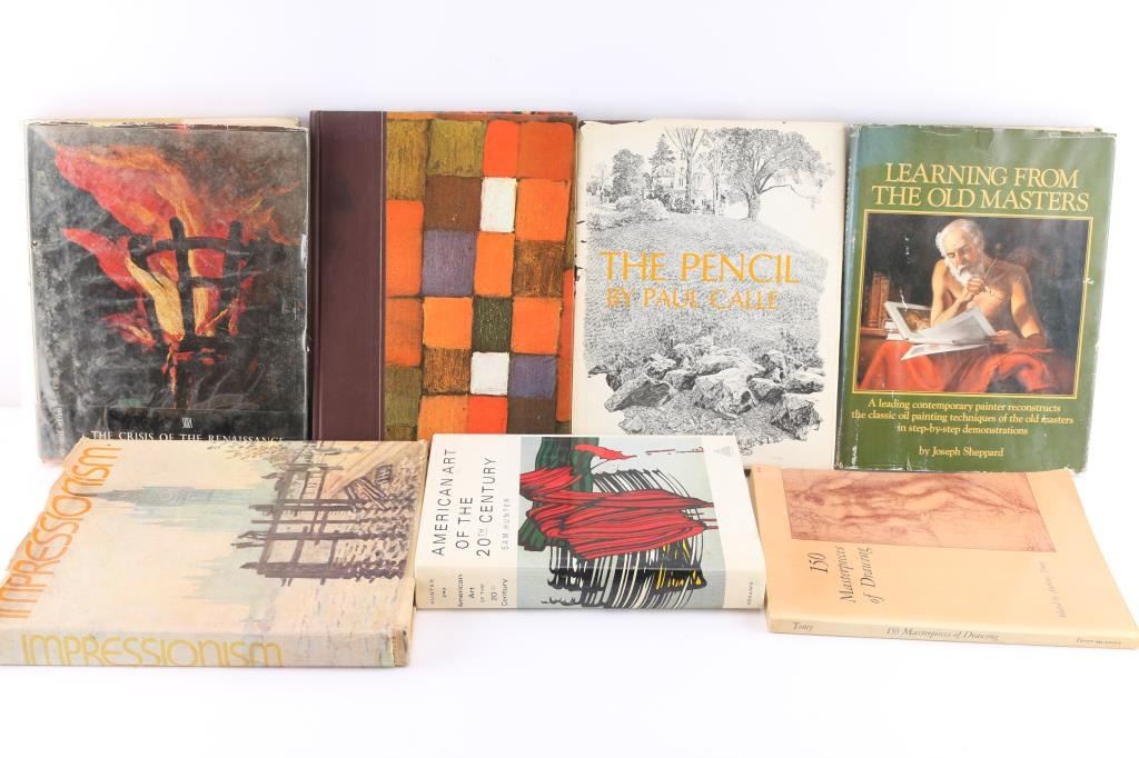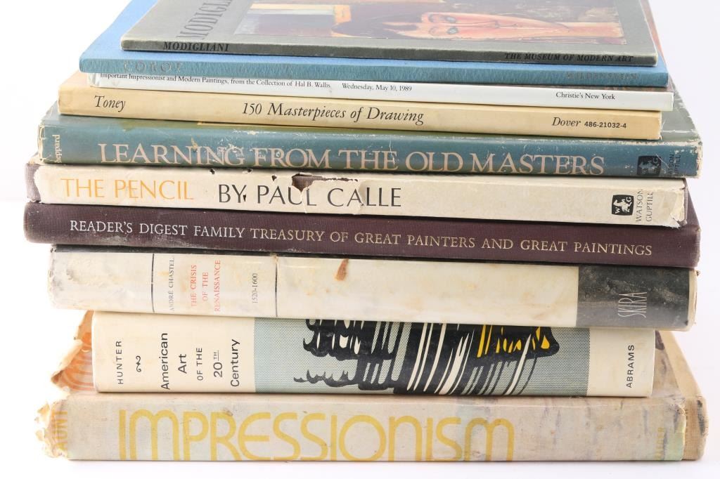 Includes: Corot by Wildenstein; Modigliani by The Museum of Modern Art with introduction by James Thrall Soby; Reader's Digest Family Treasury of Great Painters and Great Paintings; Important Impressionist and Modern Paintings from the Collection of Hal B. Wallis at Christie's New York; The Pencil by Paul Calle (book jacket torn); Learning from the Old Masters by Joseph Sheppard (book jacket worn); The Crisis of the Renaissance by Andre Chastel (book jacket worn); Impressionism, a Visual History by William Gaunt (book jacket torn); 150 Masterpieces of Drawing selected by Anthony Toney; American Art of the 20th Century by Sam Hunter.