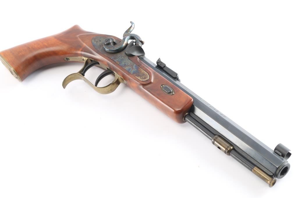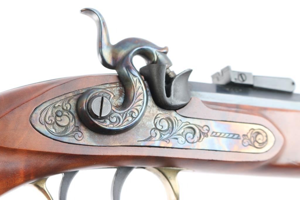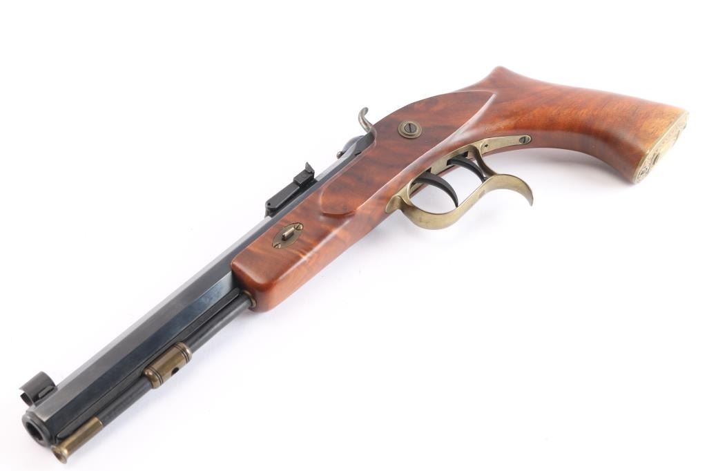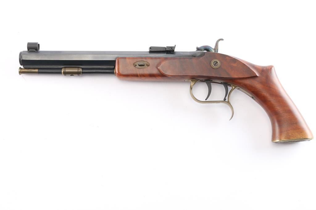 Quality American made single shot muzzle loading percussion target pistol chambered for .45 caliber ammunition. Features a blued 9" octagonal barrel, dovetailed shrouded post front sight, adjustable rear sight, double-set triggers, bass plated finger rest trigger guard, case hardened lock & hammer, wood ram rod with brass tip, and one-piece walnut stock with brass forend & grip caps. Pistol exhibits approximately 97% of it's original finish showing nice case colors and only minor handling marks, rub on the underside of triggerguard. Action is crisp but will not fire without setting the trigger, the bore is excellent and the wood stock is fine. Comes with manual.