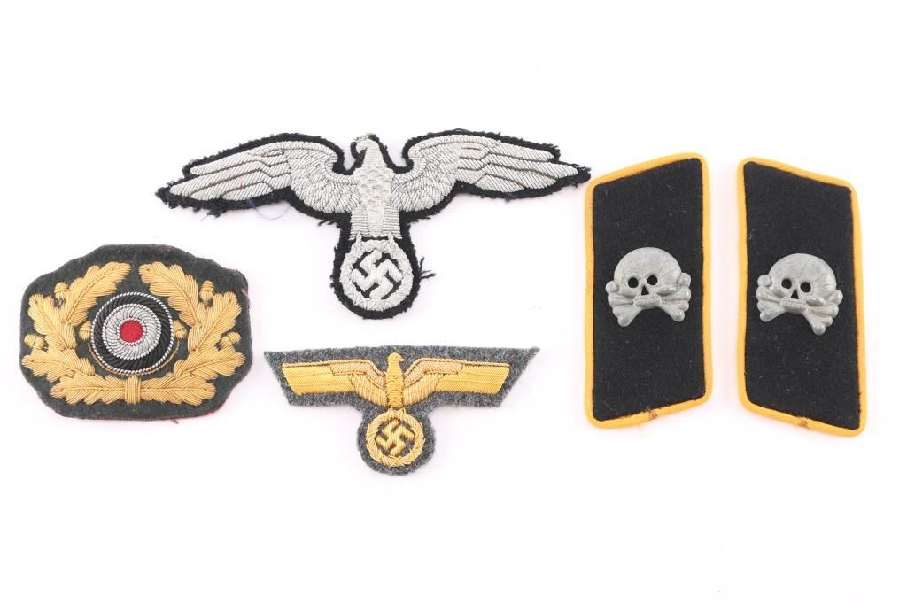 Includes: (1) set German Panzer-Aufklarung collar tabs. (1) German General cap wreath. (1) Kriegsmarine breast eagle. (1) Diplomatic personnel cap eagle.