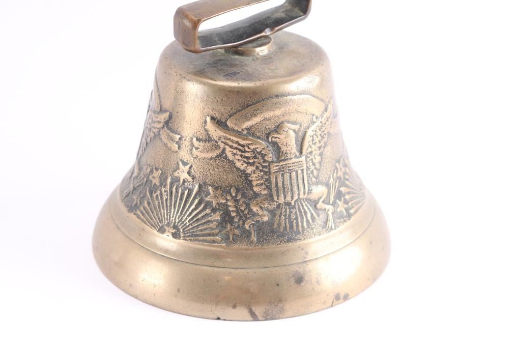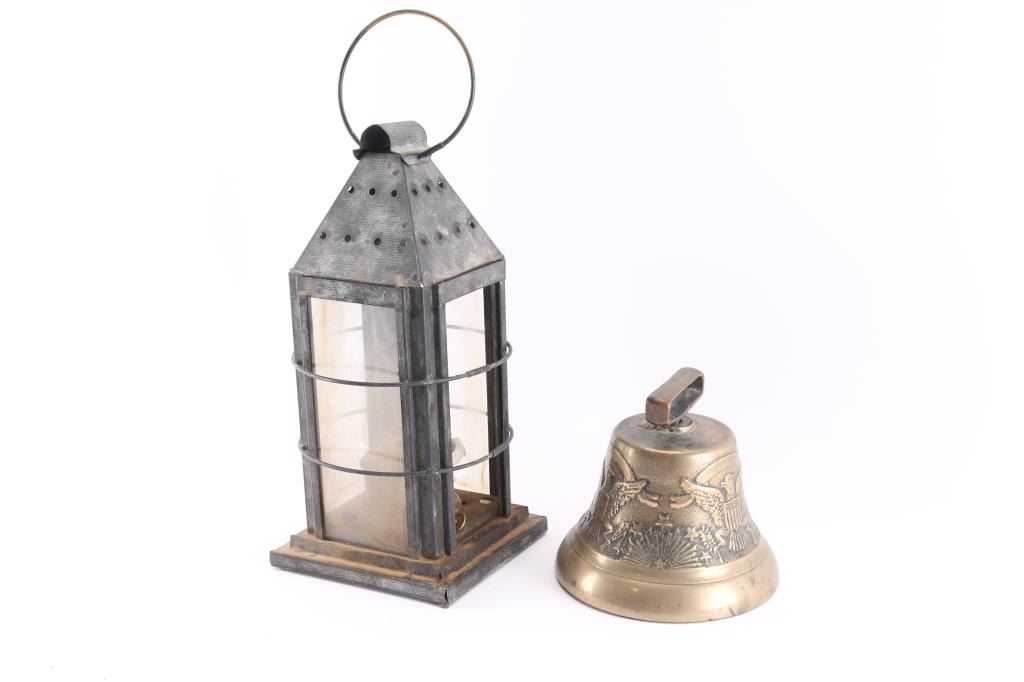 Patio decor: brass bell with eagle and shield emblem, measures 6" tall by approximately 6" across. Good condition. Tin with glass kerosene lantern, has one glass panel missing. Measures 15" tall and 5 1/2" by 5 1/2".