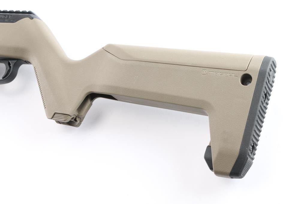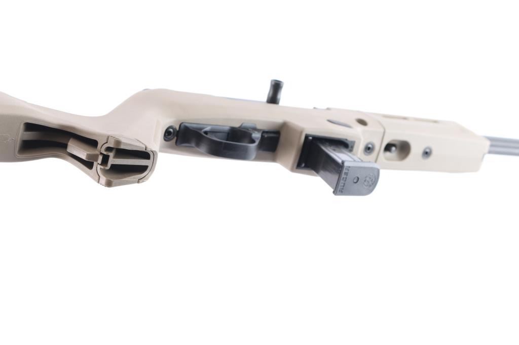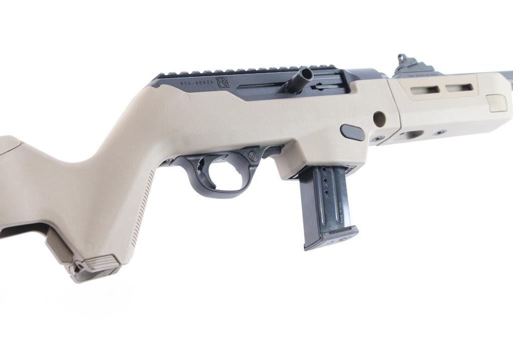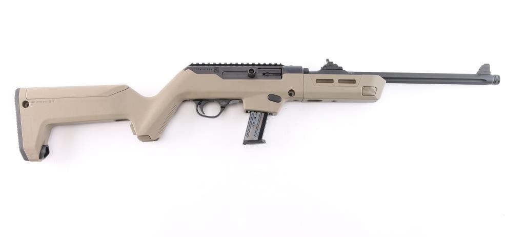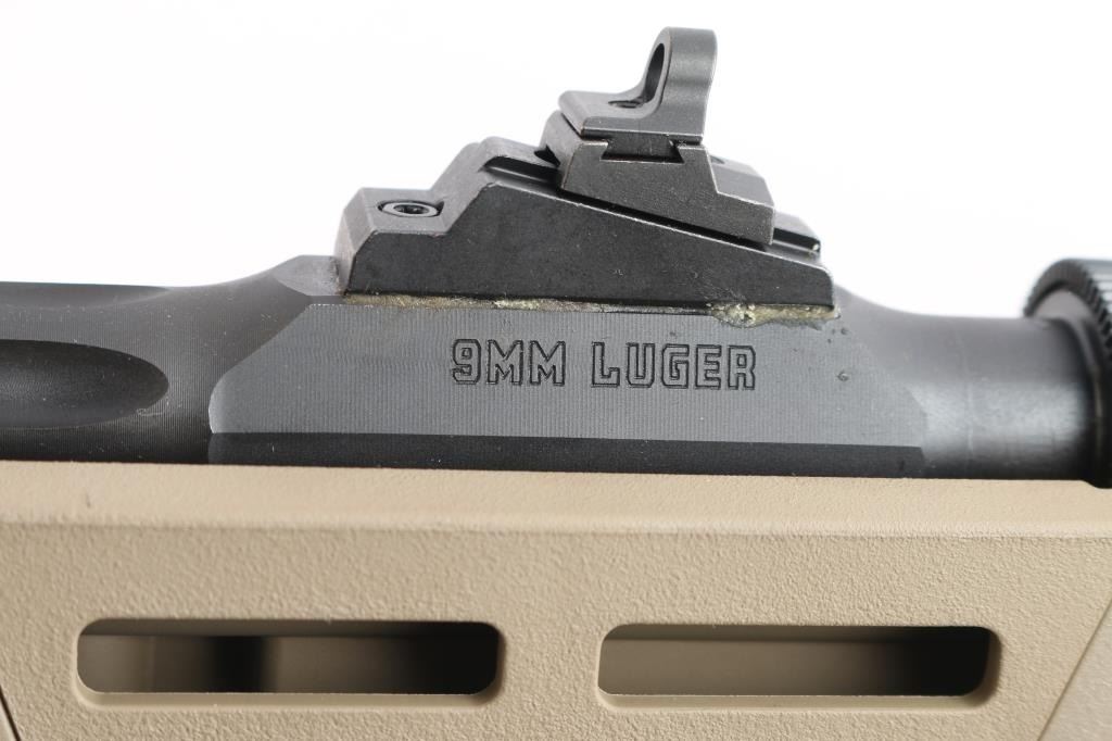 'Dead blow' action semi-automatic take-down rifle chambered in 9x19mm, manufactured circa 2023. Features a threaded and fluted 16" cold hammer forged chrome-moly steel heavy barrel with matte black finish and thread protector, shrouded blade fixed front sight, sliding adjustable ghost ring rear sight, CNC machined 7075-T6 aluminum alloy receiver with integral Picatinny rail & Type III hard-coat anodized matte black finish, reversible push button magazine release, reversible cylindrical charging handle, interchangeable SR9 pattern magazine well, push button safety, serrated curved wide trigger, FDE polymer forend and pistol grip Magpul Backpacker shoulder stock with provisions for QD cups. Butt stock has interchangeable top door to adjust for comb height. Bore is very good. Retains approx. 98% finish only minor losses. Action is smooth. Comes with one 17rd magazine, additional magazine well for Glock magazines, additional butt stock compartment door, tools, manual cable lock and factory box. Condition is NRA excellent. ***Modern Firearm***.