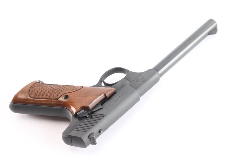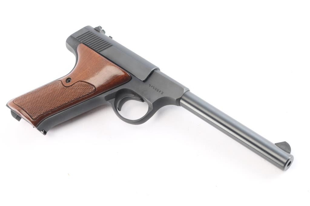 'Third Series' Vintage single action semi-automatic target pistol chambered in .22 Long Rifle, manufactured circa 1969. Features a matte/polished blued finish, 6" round barrel, serrated blade front sight, dovetailed rear sight with square notch, smooth wide trigger, concealed hammer, thumb safety/slide catch on the left slide of the frame, heel magazine release, 10 round factory magazine, steel frame and checkered walnut grips. Includes a factory two-piece wood grain cardboard box with missing end label, tool and instruction sheet. Box shows wear. Pistol retains approximately 98% of its original blued finish showing minor handling marks. The action is smooth/sound, the bore is excellent, markings are crisp and the wood grips are excellent.