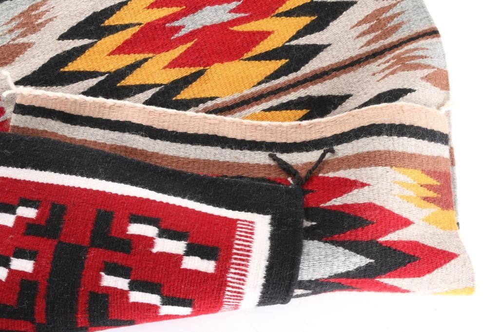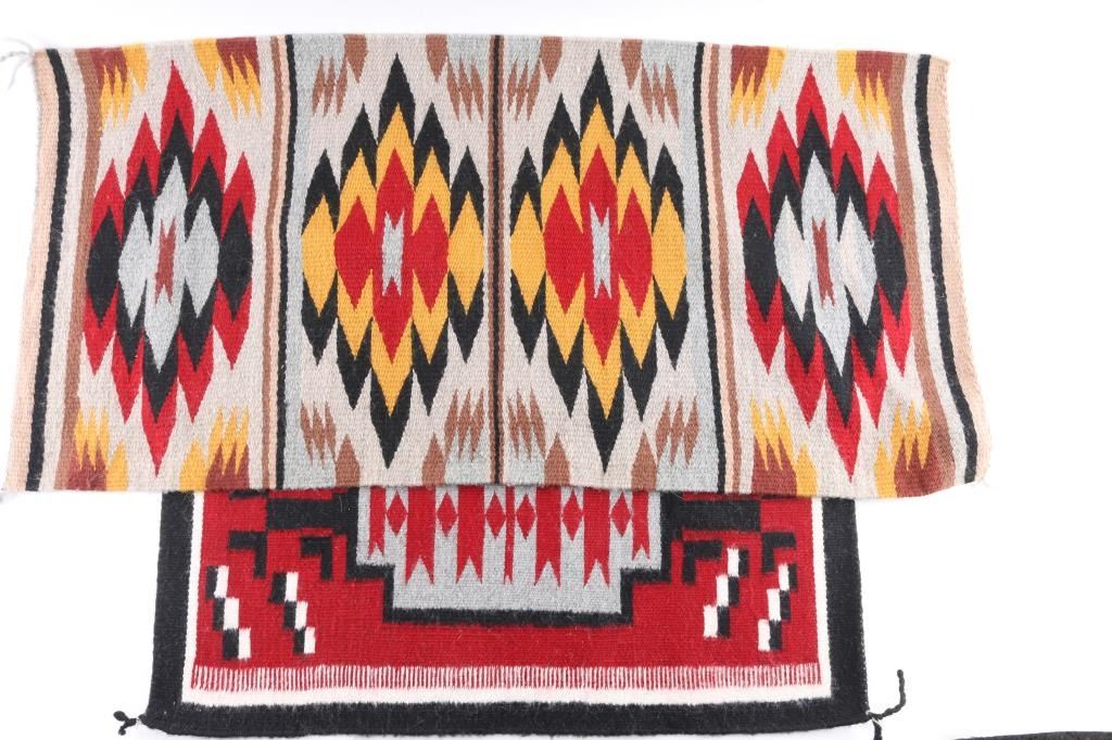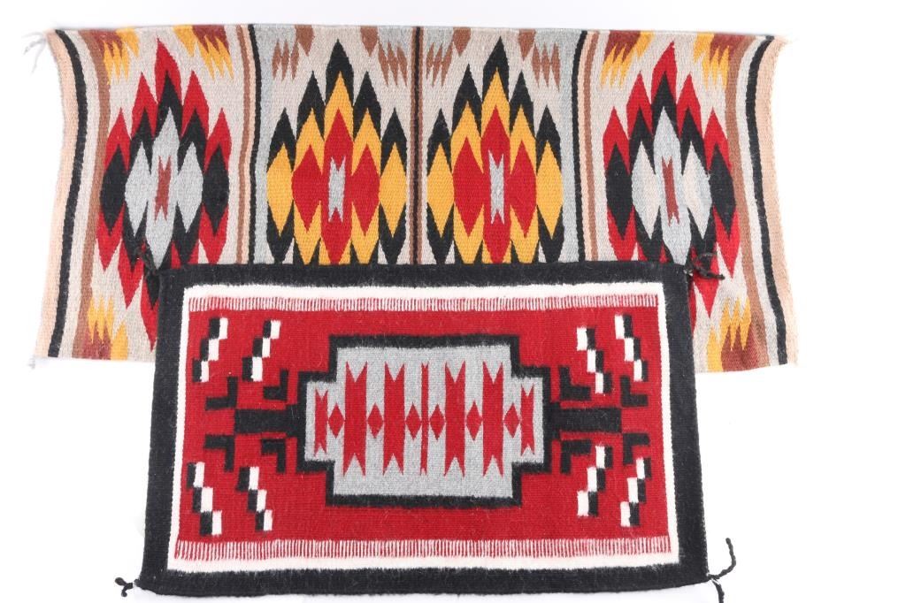 Table top type. Larger rug is in grey, red, black, white, yellow with crystal pattern. 38 1/2 x 19". Smaller rug in red, black and white with geometric pattern measures 27 x 16".