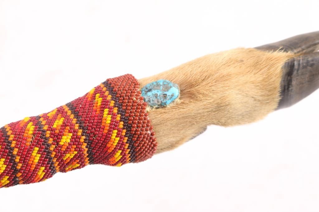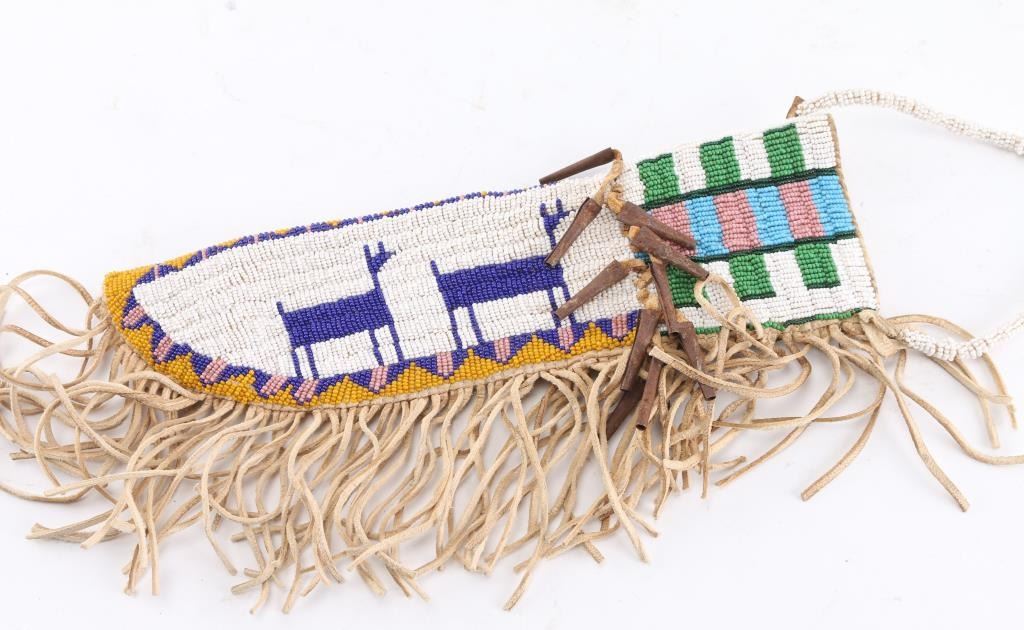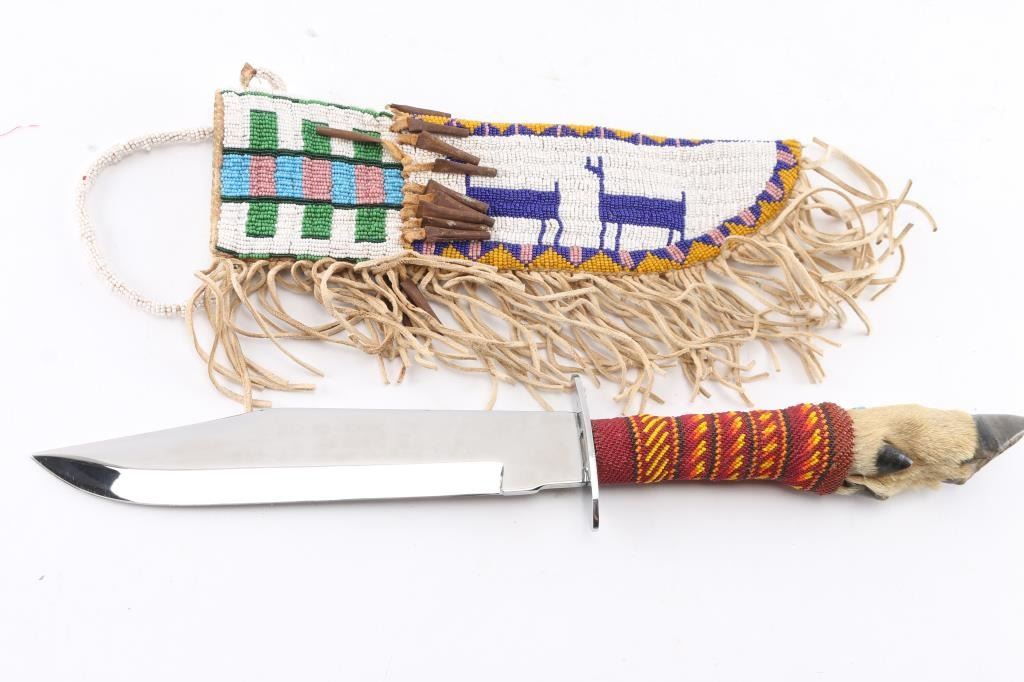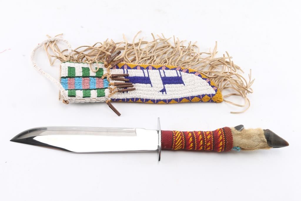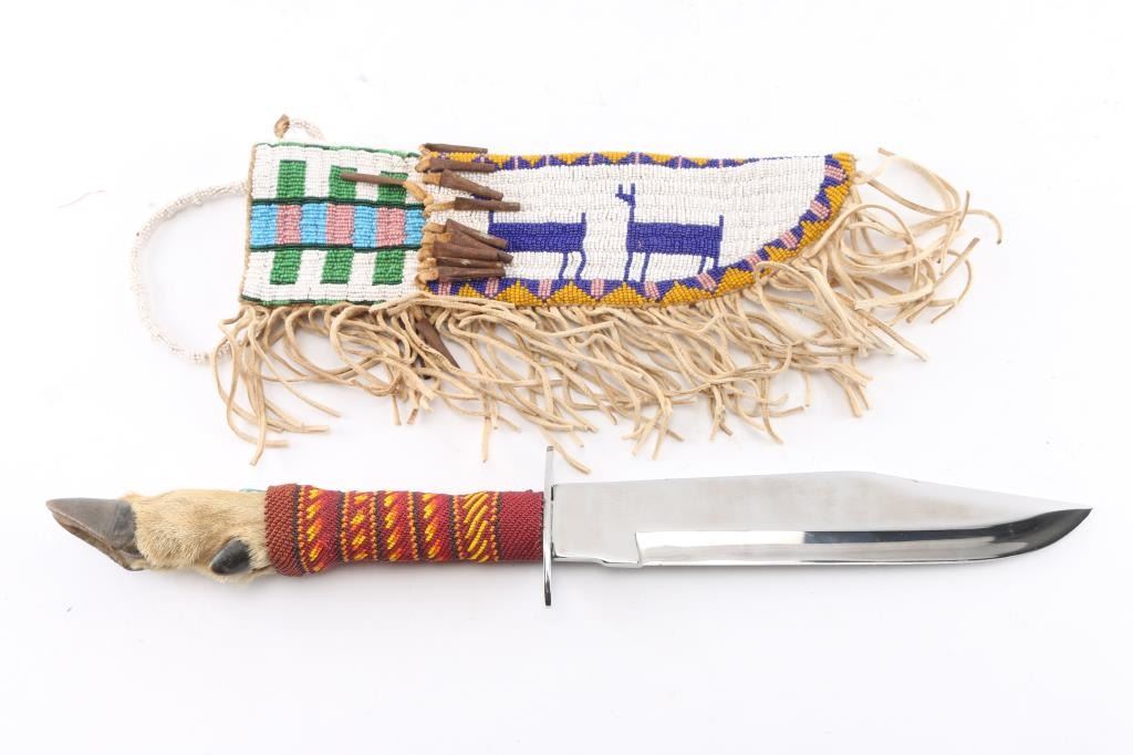 Large nickel bowie knife with hoof and beaded handle. High polish nickel blade, measures 18 1/2" overall with 9" blade. Fully beaded two sided sheath with beaded deer motif, with jingle beads and fringe. Measures 12 x 3 1/2". In overall very good condition.
