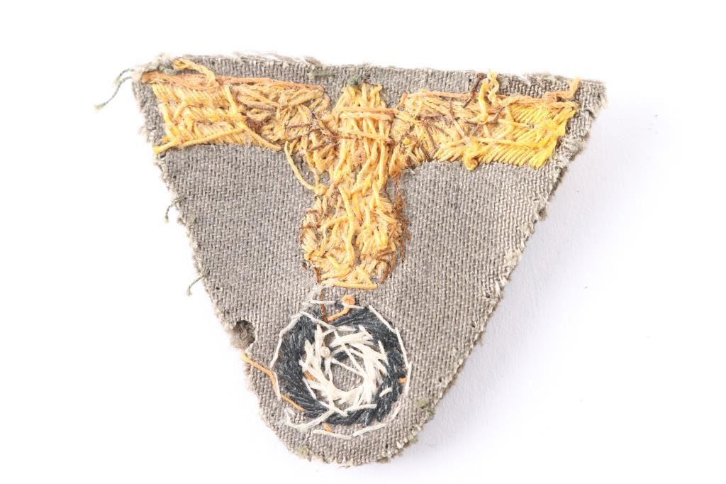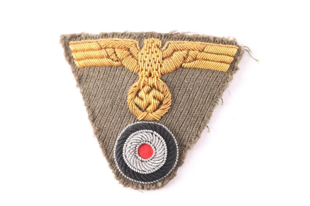 German WWII Kriegsmarine Coastal Artillery Officers Cap Eagle And Cockade Trapezoid. Not typical German and believe that this was French made, most likely a private purchase. Evidence of having been removed from cap. Quality wire embroidered construction. Believe original, please look carefully at photos.
