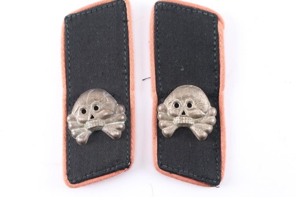 EM Heer Assault Gun collar tabs. Matched pair. Black woolen construction with machine sewn pink panzer piping, 3 prong late war, type 7 Totenkopfs attached. Specifically used by the Sturmgeschütz (Stug) units, which were part of the Panzer division. Construction, design and materials are all correct. Show age and wear. The Buckram backings are missing exposing the correct cardboard interior. Believe original, please look carefully at photos.