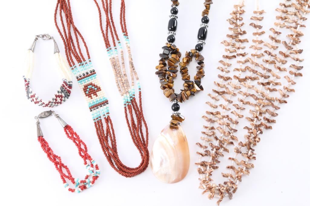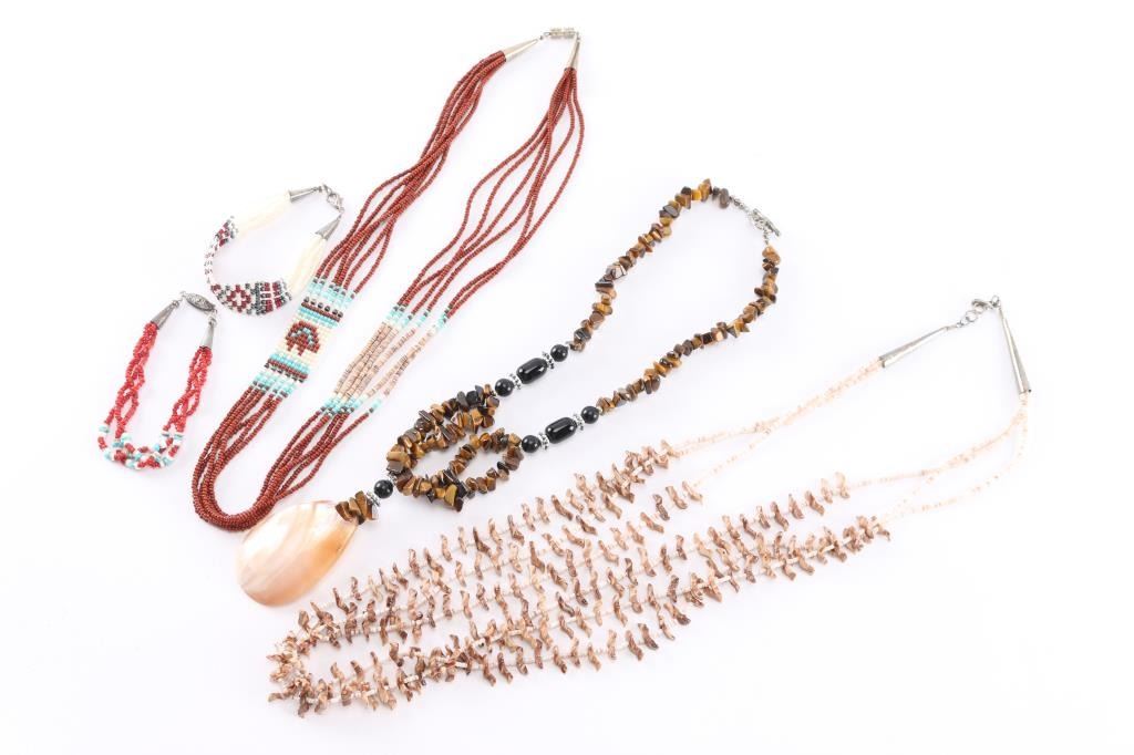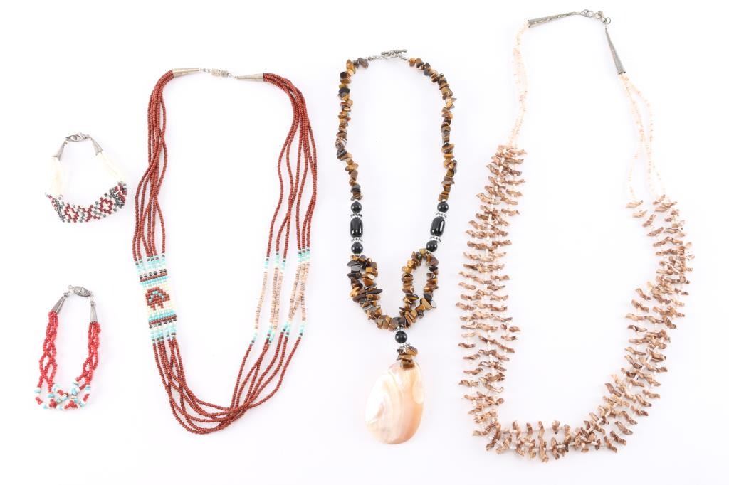 3 Strand Natural Brown Stone Heishi Necklace Measuring 14 1/2" From Drop; Tiger's Eye Nuggets And Shell Necklace Measuring 12" From Drop; Rust And Other Color 6 Strand Seed Bead Necklace Measuring 11 1/2" From Drop; 2 Seed Bead Bracelets.