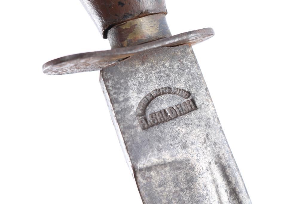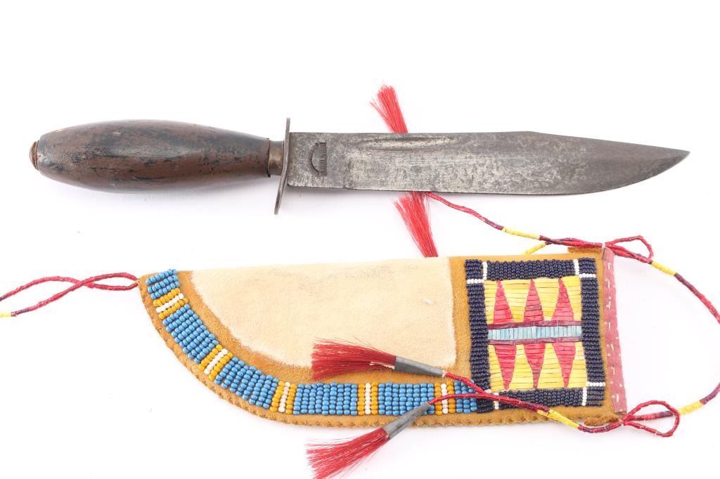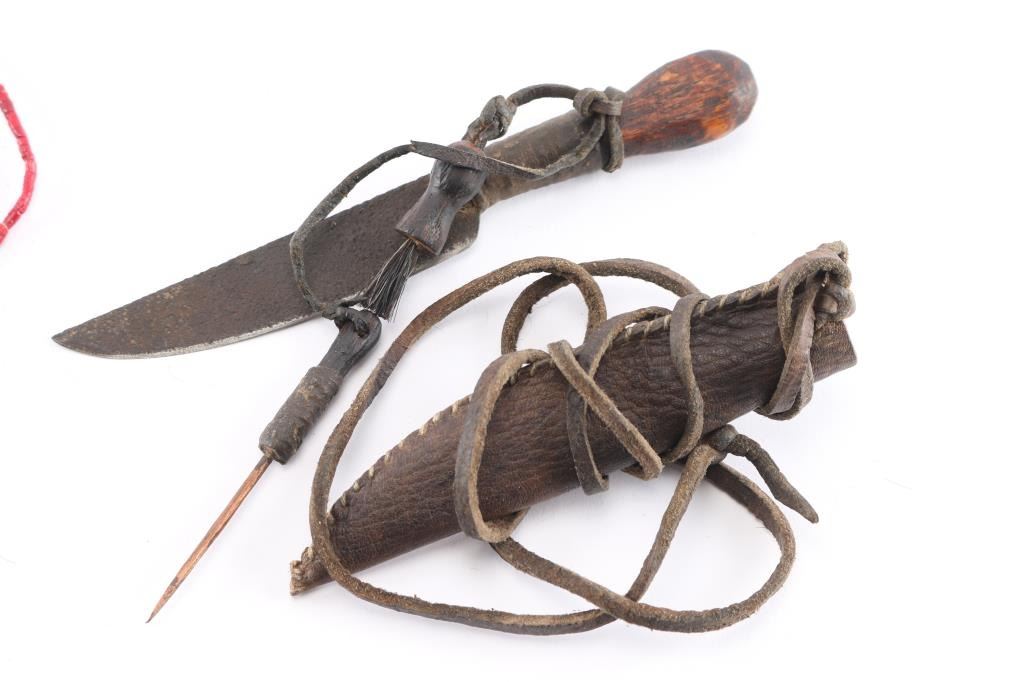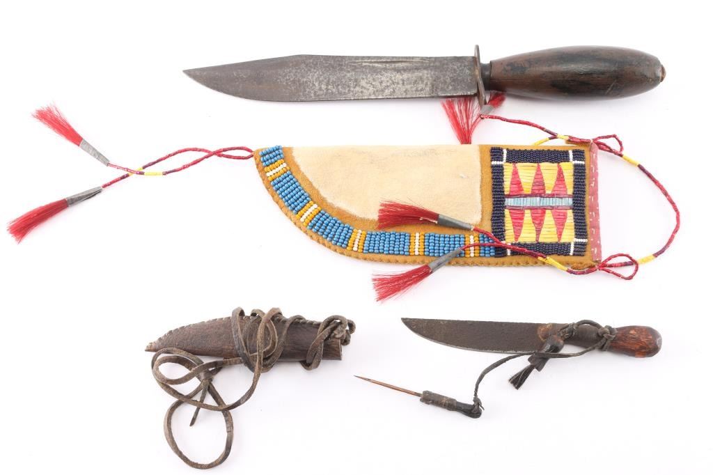 With sheathes. The first measures 12" long with 7 1/2" maker marked steel blade and wooden handle. Sheathe is rawhide with beaded, quilled and horsehair enhancements. In sheathe length is 13". The second measures 6 1/2" with 3 1/2" blade, with wood or antler handle. Brown leather very worn sheathe.