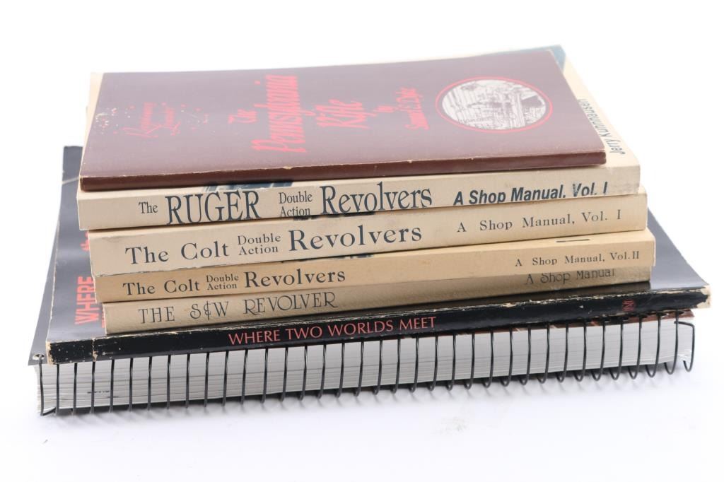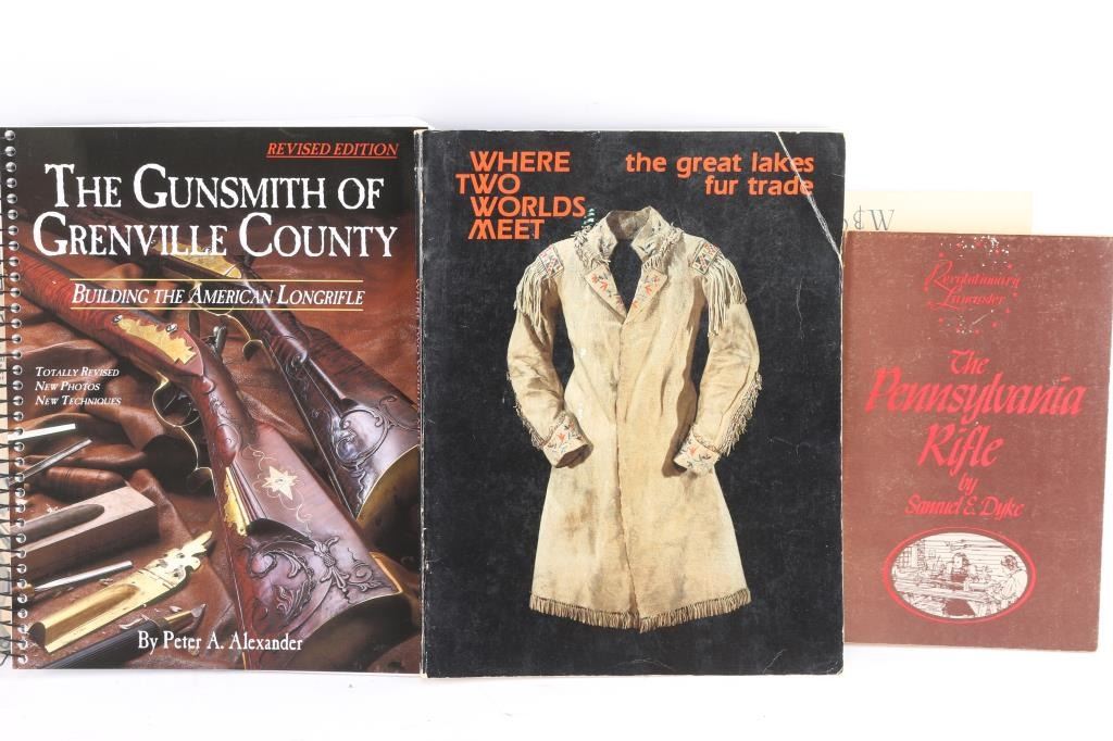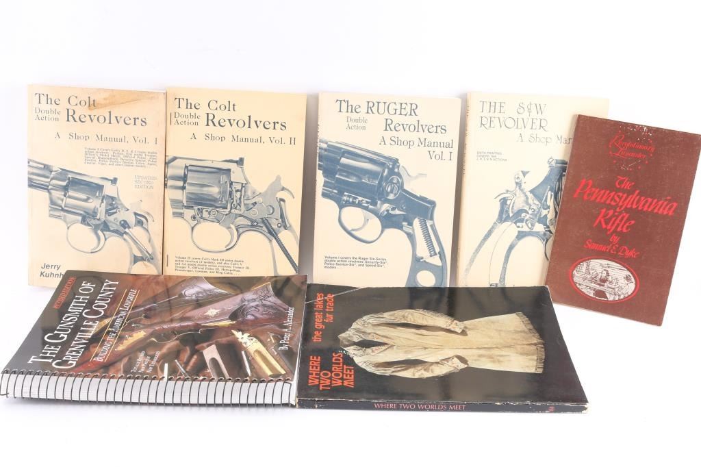 Includes: The Gunsmith of Grenville County, Building the American Longrifle (Rev. Ed. 2012) by Peter A. Alexander, good to very good condition; Where Two Worlds Meet, the great lakes fur trade (Copyright 1982) publications of the Minnesota Historical Society; The Pennsylvania Rifle by Samuel E. Dyke; Series of books by Jerry Kuhnhausen - The Colt Double Action Revolvers Vol. I & II, The Ruger Double Action Revolvers Vol. I and The S&W Revolver, all fair to good condition.
