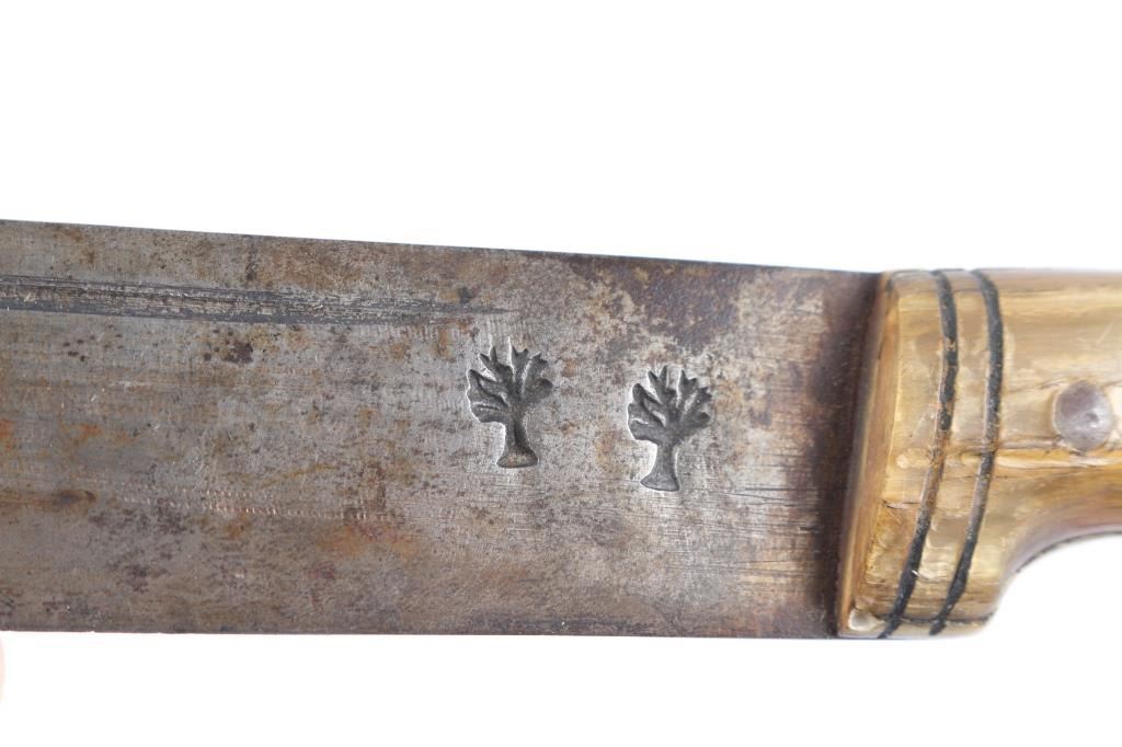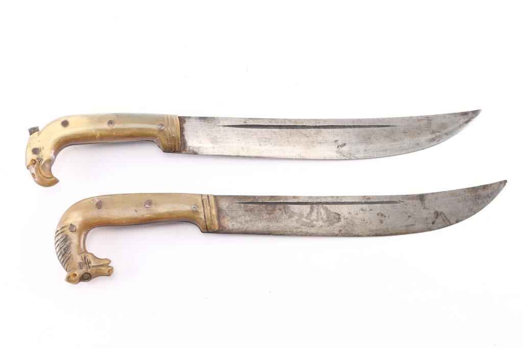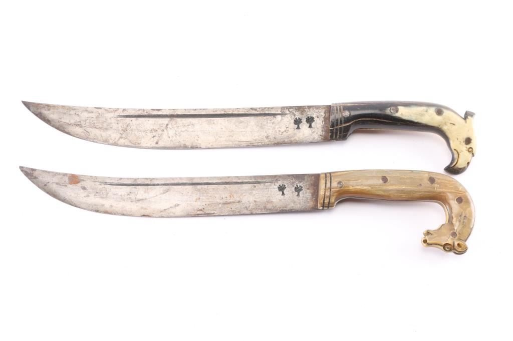 Measure 13 1/2" total with 8 1/2" maker marked blades. Handles carved of antler and deer horn.