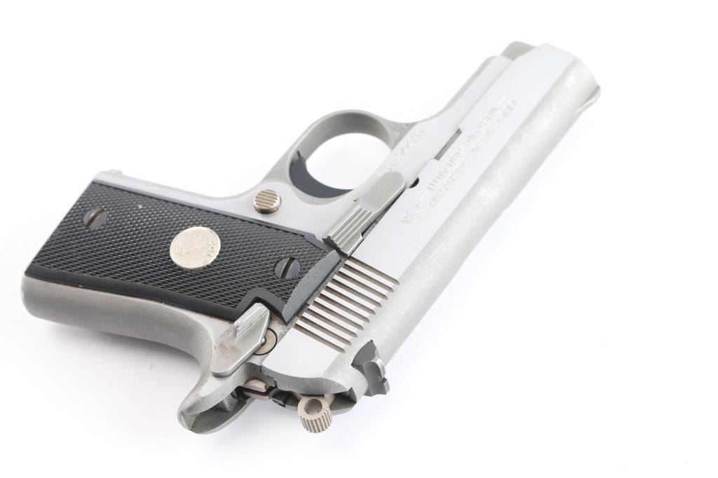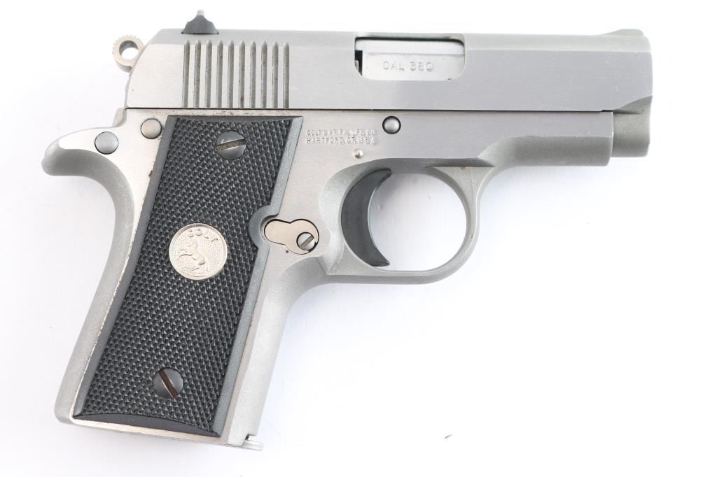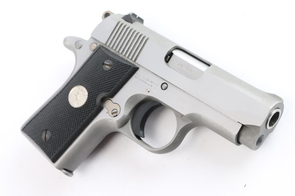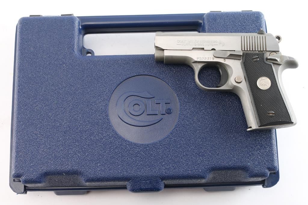 'MK IV/Series'80' Stainless steel single action semi-automatic sub-compact pistol chambered in .380 Auto. Mfg. circa 1996. Features a matte finish with polished flats, 2 3/4" barrel, fixed front sight, dovetailed square notch rear sight, serrated trigger, serrated round hammer spur, push button magazine release, factory 7 round magazine, thumb safety on the left side of the frame, and checkered black polymer grips with silver Colt medallions. Includes a factory blue hard case. Pistol exhibits minor scratches and scuffs with no major wear. The action is mechanically sound, the bore is excellent, and the polymer grips are very good with some wear.