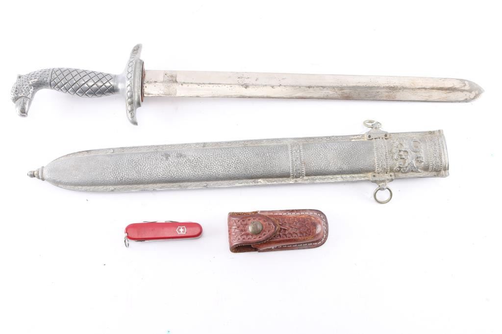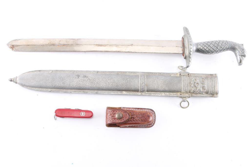 Vintage copy of a ancient short sword. made in the style of a Gladius Eagle of Rome sword but has images of the Greek Gods Hermes and Athena on the two ring scabbard. Pewter pommel and scabbard, 17 1/2" nickeled blade. Blade marked with makers name, appears to be Italian but can't make in out. Antique as the sword and leather washer show a lot of age, probablely Victorian era. Overall very good condition with signs of light sharpening and scuffs to the blade. also included is a Victorinox Swiss Army Knife. multi-tool with tooled brown leather belt pouch, very good condition.