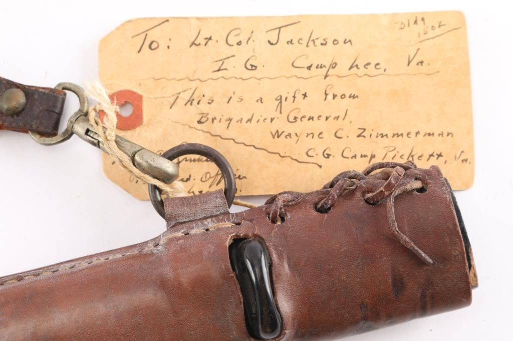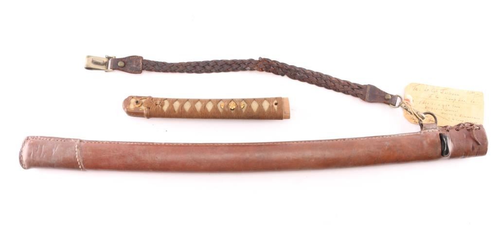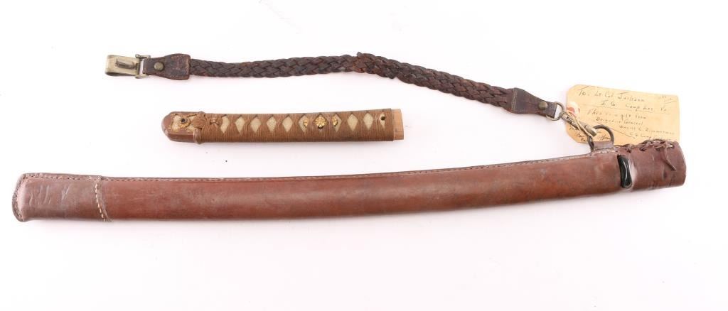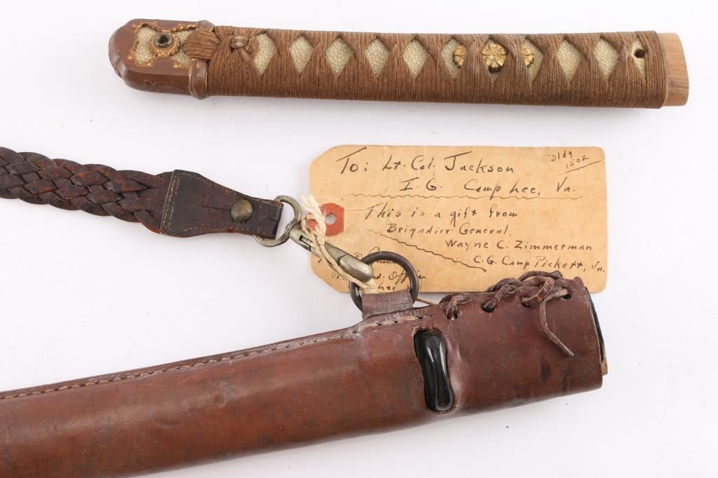 WWII Japanese Army Officer’s Type 98 Shin Gunto 28" scabbard. Black lacquered wooden scabbard and complete cloth wrapped handle. Very good condition. Has a old tag attached that reads "To: Lt. Col. Jackson, I.G. Camp Lee, Va. This is a gift from brigadier General Wayne C. Zimmerman, C.G. Camp Pickett, Va." Comes with period woven leather construction sword hanger with steel and alloy clip and hook