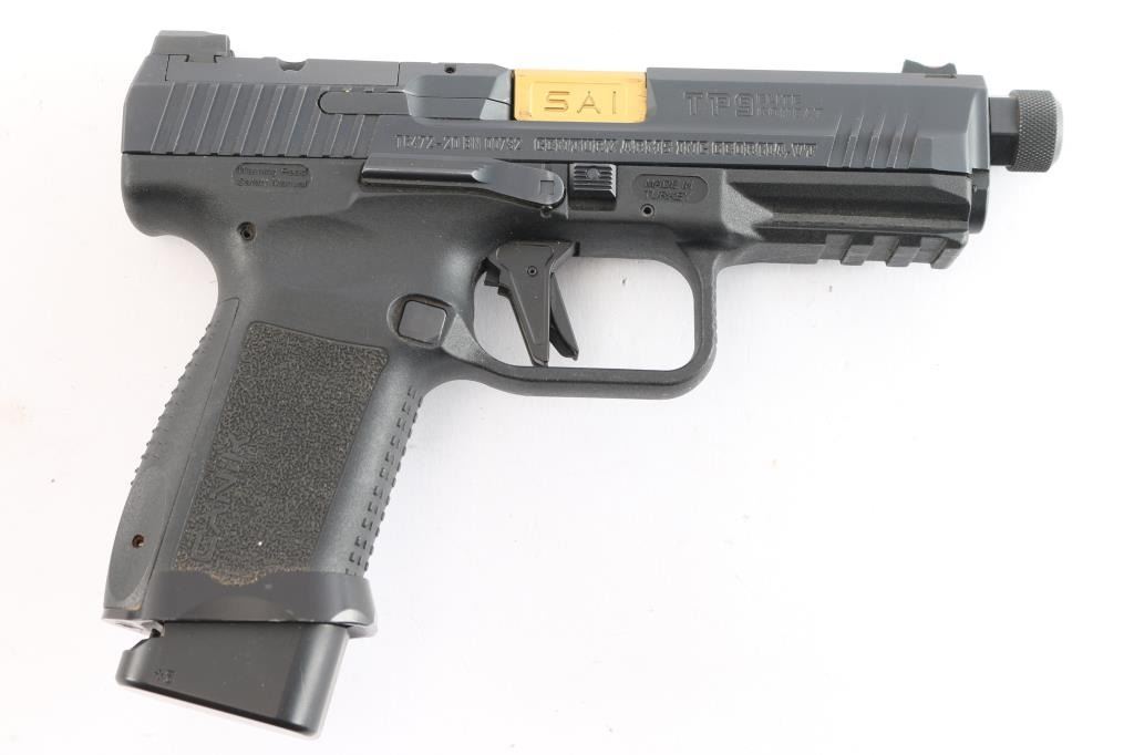 'Executive' made in Turkey this semi-auto medium-sized pistol is chambered for 9x19 ammunition. It features a 4.6" Salient Arms match grade threaded barrel with a gold PVD finish and a Salient Arms aluminum fluted magwell, serrated flat aluminum trigger, serrated blackout rear and red fiber optic front sight, optic cut slide with front and rear slide serrations, textured grips with stippling on the sides. Extended mag release button, ambidextrous slide lock, loaded chamber indicator, cocking indicator and an accessory rail. Bore is very good/slightly dirty. Retains approx. 98% finish with little to no scratches or wear. Comes with original factory black plastic hard case, two magazines, one 18rd and one 15rd w/extension and speed loader, extra back strap, cleaning brush and rod, spare red and green fiber optic front sight inserts, optic mounting plate and a kydex paddle holster. Condition is NRA excellent.