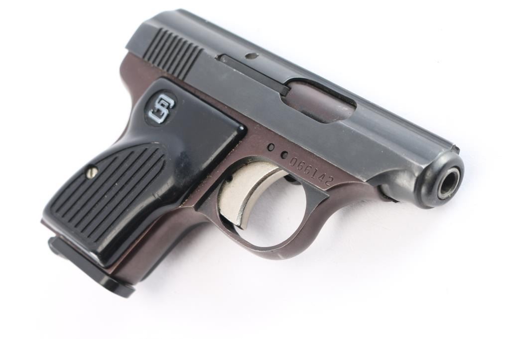 American made compact pocket pistol. 2 1/4' barrel, ingral sighting channel, blue slide, plum colored frame, manual safety, heel magazine release, plastic grooved grips, 6-rd magazine. Bore is very good, strong rifling, grips and finish are very good. Production ended in 1984.