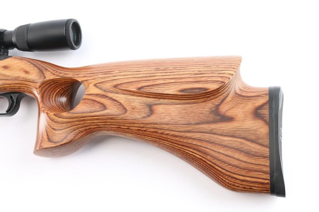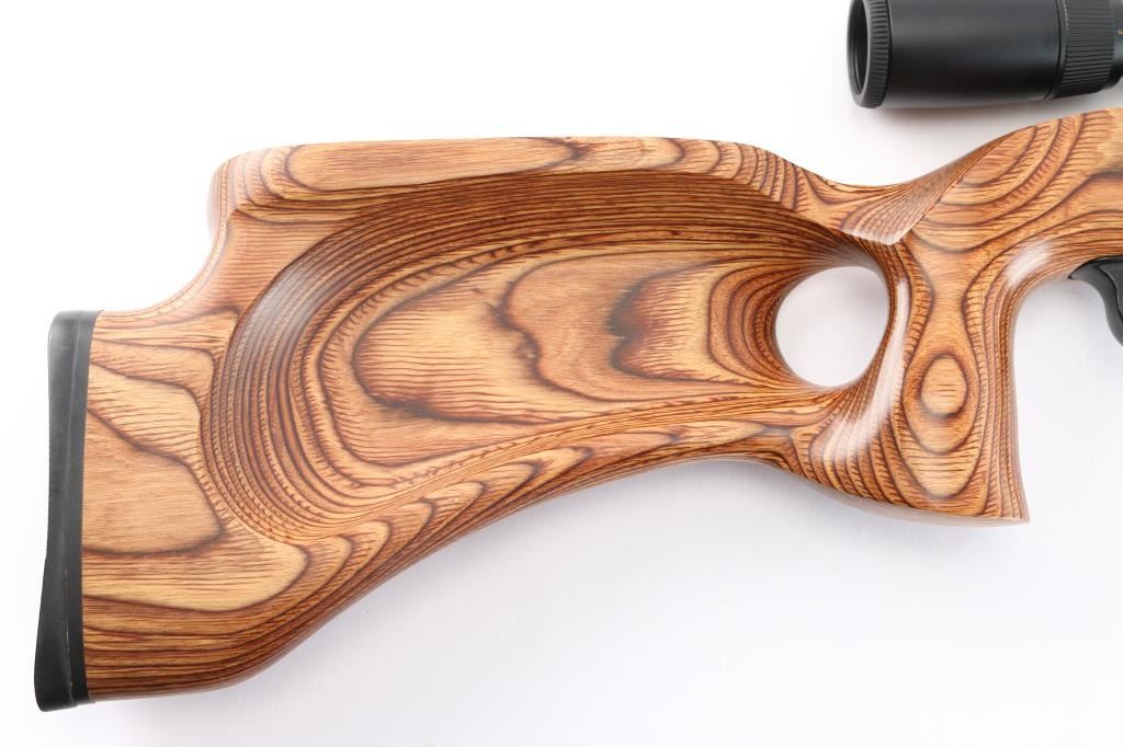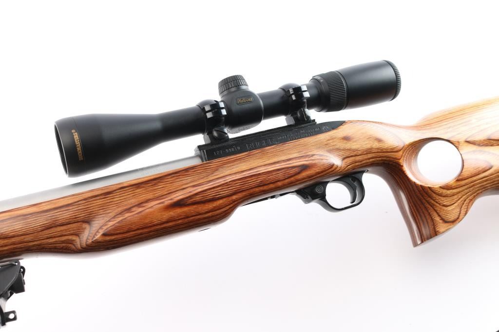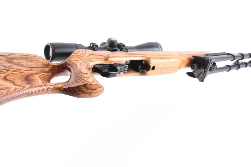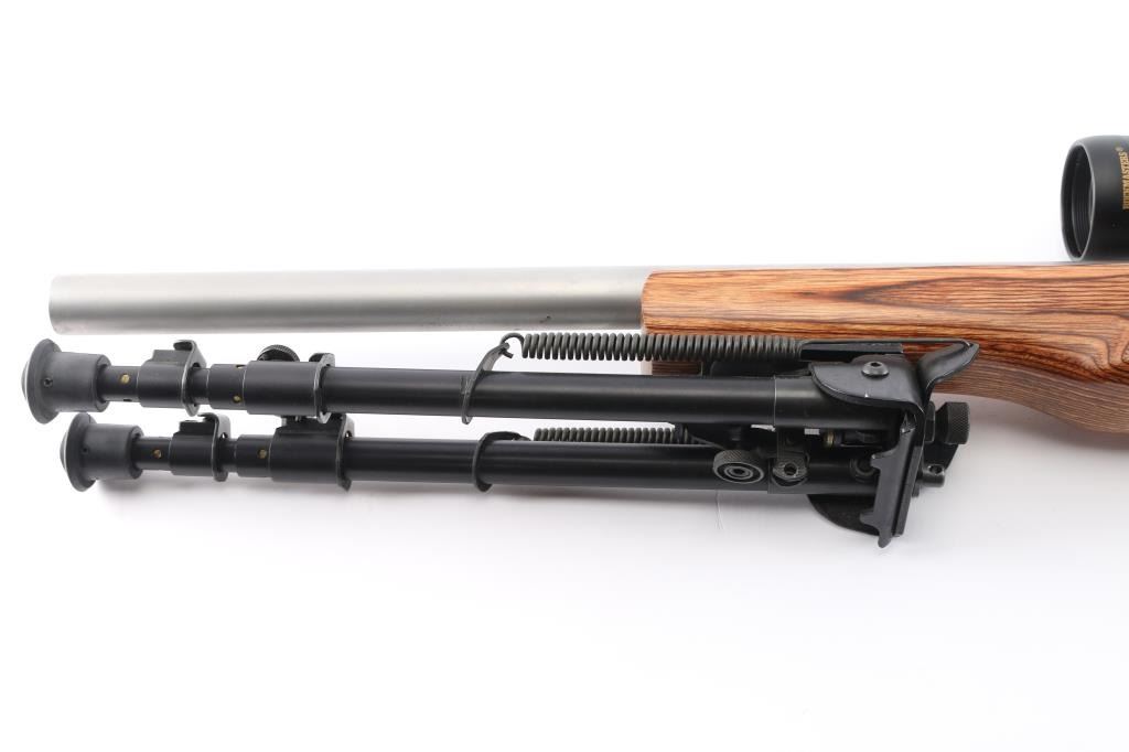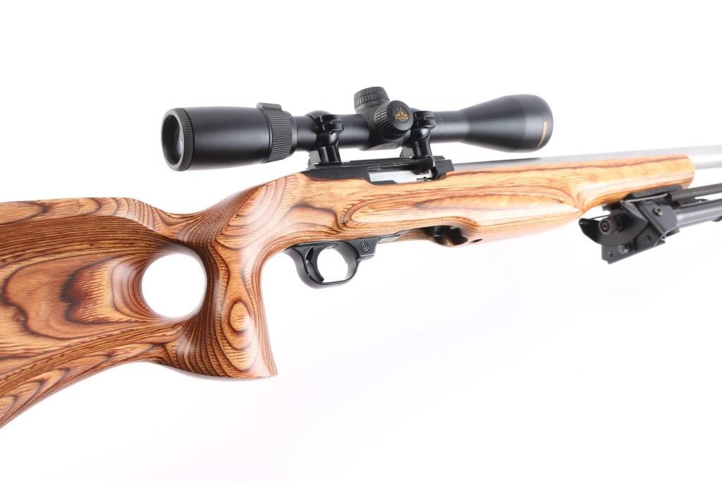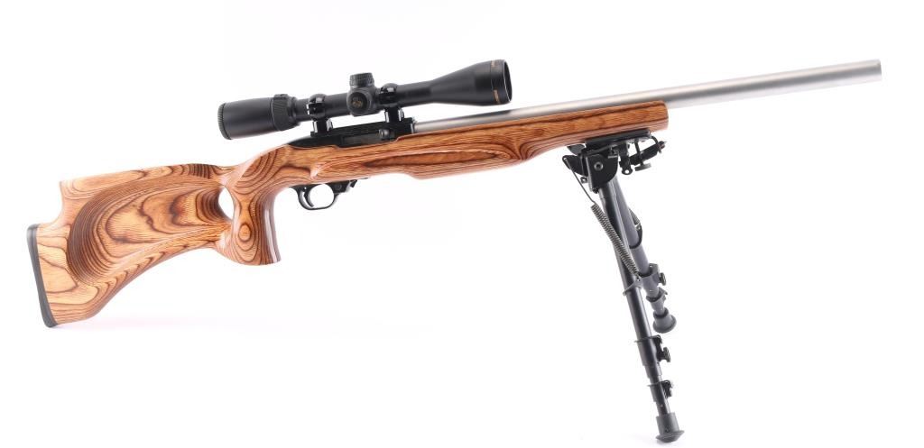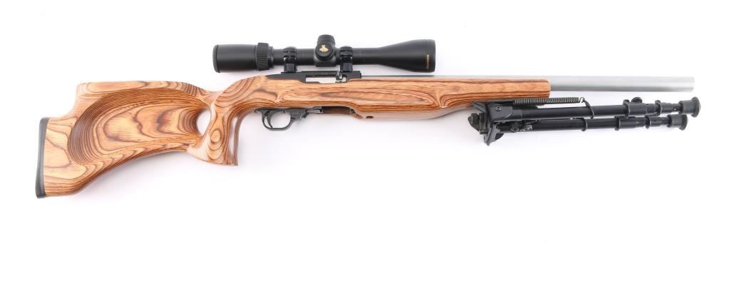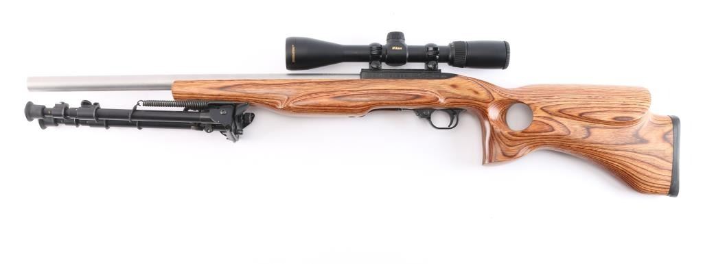 Upgraded and customized 10/22. 20" Butler Creek heavy stainless steel barrel with recessed crown, no provisions for sights, brushed finish, Fajen brown laminated thumbhole stock, high comb with roll over cheek piece, Harris S25 bipod installed. Mounted with a Nikon 'Buckmasters' 3-9X40 scope, duplex reticle, clear optics. Bore is excellent/bright, wood is excellent and the finish id very good with some minor scratches on the black alloy receiver.