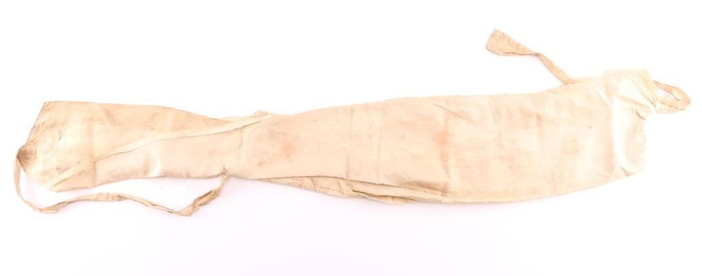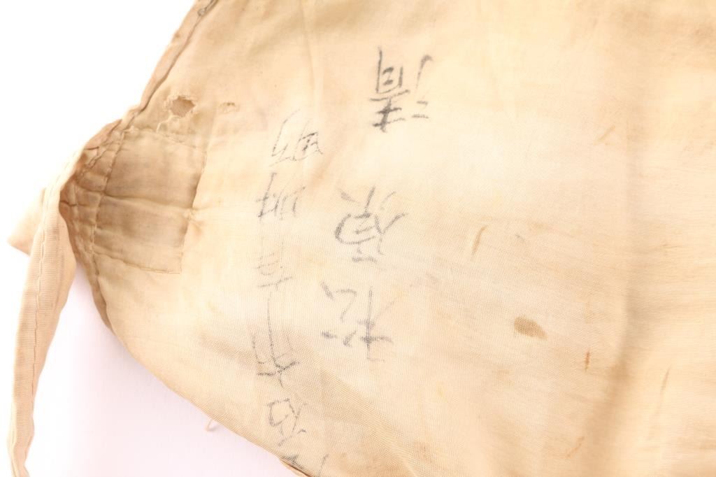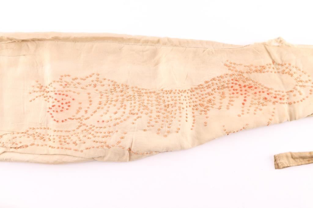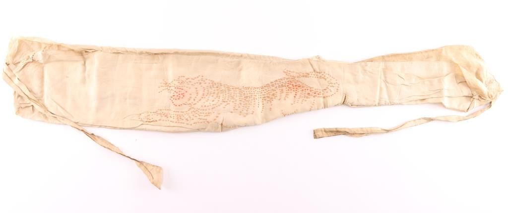 A senninbari, 'thousand person stitches') or one thousand stitch is a belt or strip of cloth stitched 1,000 times and given as a Shinto amulet by Japanese women and imperial subjects to soldiers going away to war. Original WW2 manufacture. A nicely worn thousand stitch belt, with the stitches done in the outline of a leaping tiger, feint Japanese writing and flag. The cotton fabric shows staining from use and wear, but is without holes or tears, it measures 40 inches in length with ties.