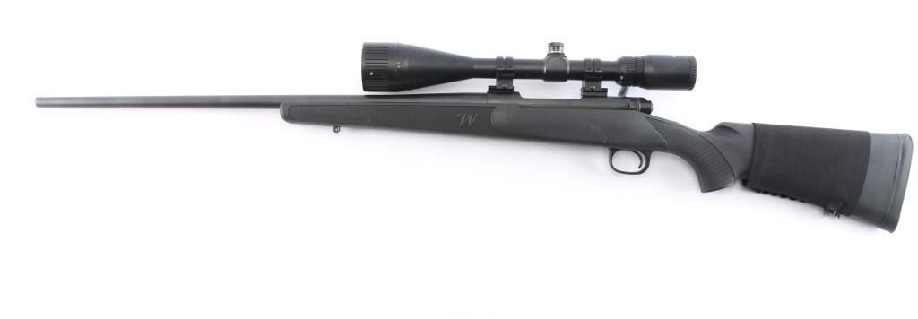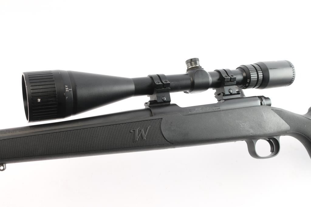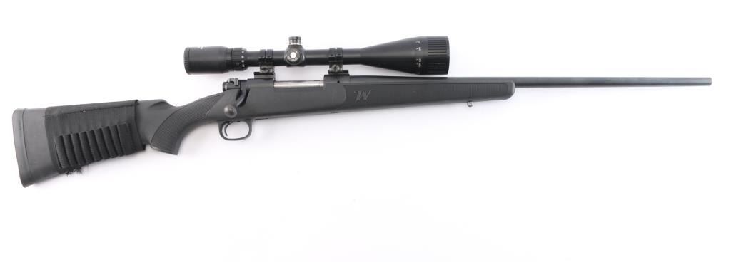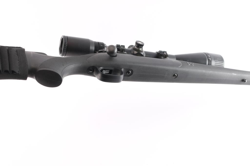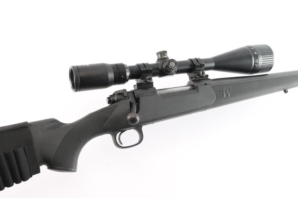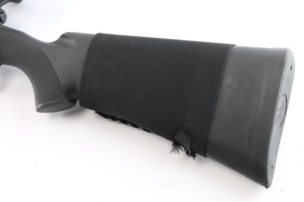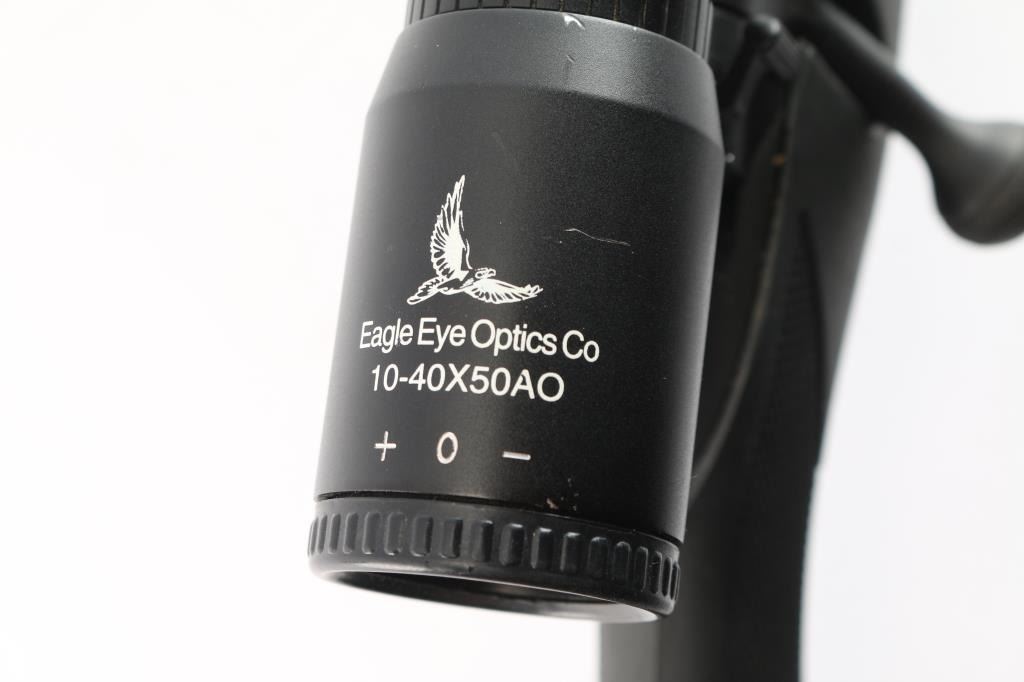 Bolt-action sporting rifle chambered in .30-06 Springfield. Features a satin black finish, 24" tapered barrel w/ recessed target crown, no provisions for sights, mounted Eagle Eye Optics 10-40X50mm rifle scope, blind magazine, and a black polymer triggerguard. Serrated curved wide trigger, three-position safety, black polymer stock w/ checkered wrist and forend and a black rubber recoil pad. Jeweled bolt is a two lug push feed. Bore is very good/slightly dirty, action is smooth. Retains approx. 98% finish with muzzle wear,, scratches and scuffs. Scope body has edge wear and minor dings. Scope is clear. NRA Condition is Very Good. ***Modern Firearm***.