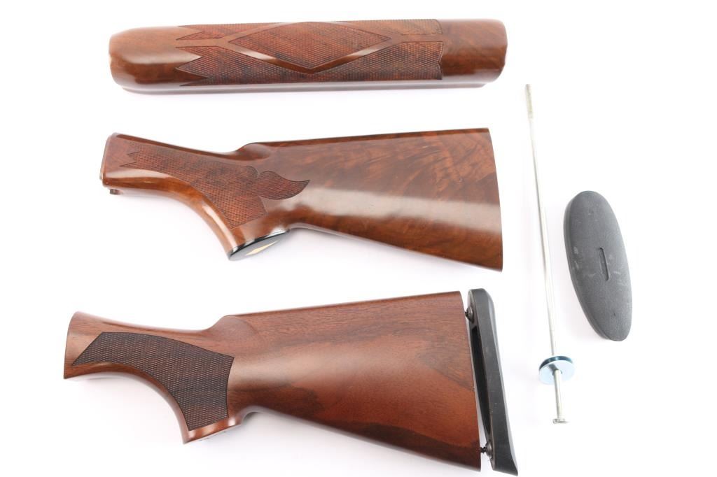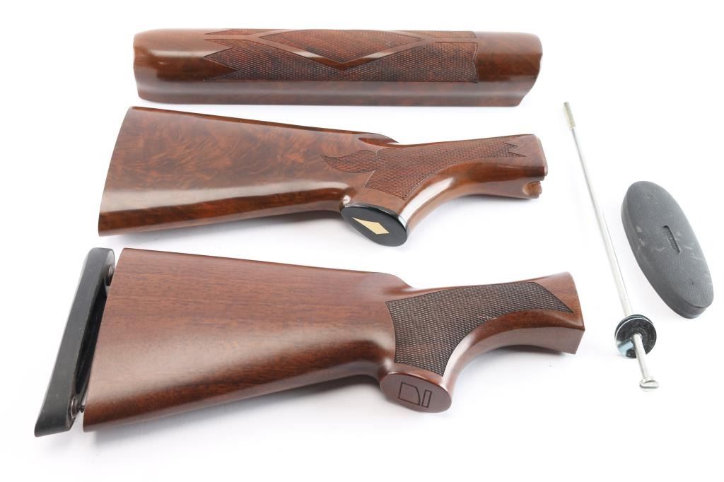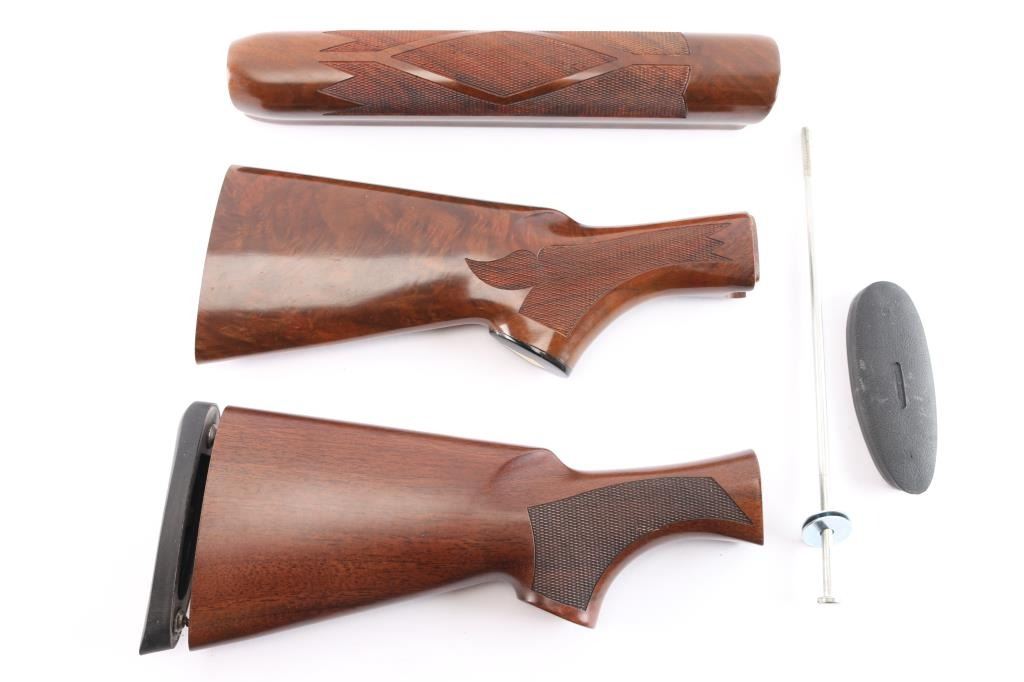 Includes: 1 - Remington 1100 stock set (buttstock & forend) for 20 Gauge. Walnut w/High gloss finish w/checkered panels on grip and forend, soft rubber recoil pad, inlaid grip cap w/white diamond and hardware. Stock measures 12" w/recoil pad. Retains approx. 98% finish with little to no scratches and or marks. Buttstock and forend are in excellent condition; 1 - Benelli Montefeltro buttstock w/recoil pad, for 20 Gauge shotgun. Measures 11 1/2" w/recoil pad. In perfect condition.