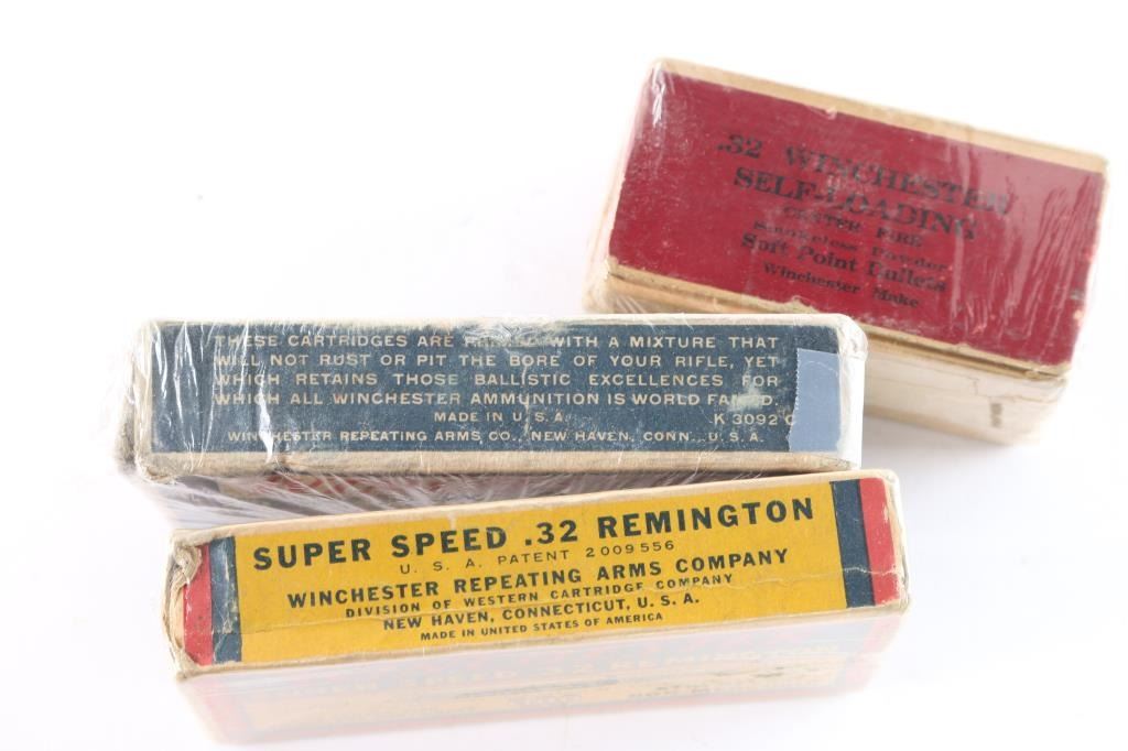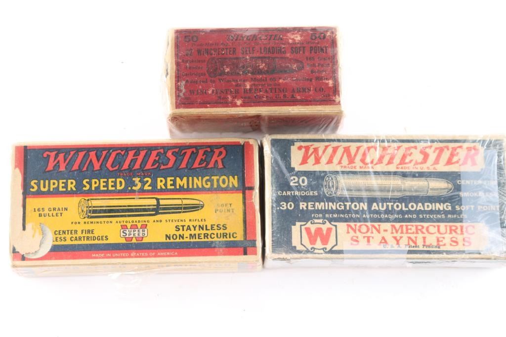 Includes: Lot of 3 opened full boxes of collectible cartridges. (A) Winchester MFG red label .32 self-loader ( 165gr). Fair to good condition. (B) Winchester .30 Rem auto-loader staynless (170gr). Blue and red box. Good condition. (C) Super Speed .32 Remington red and yellow box. Good plus condition.