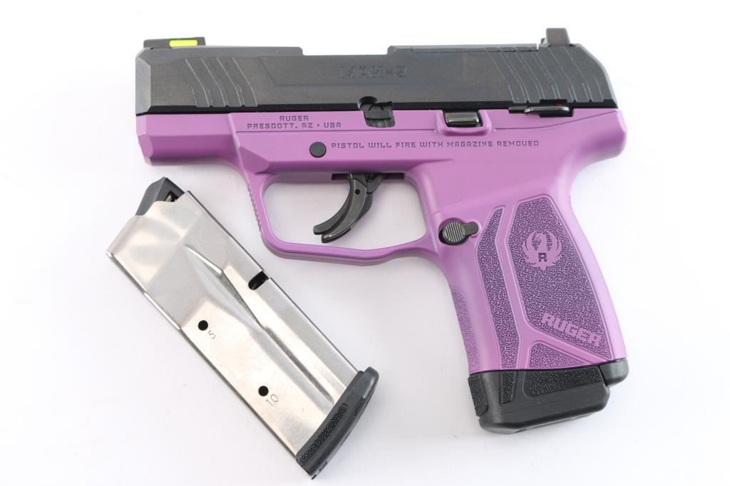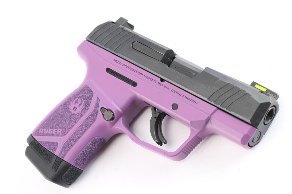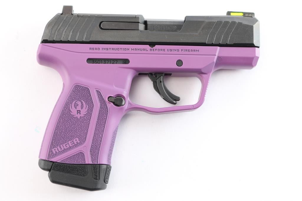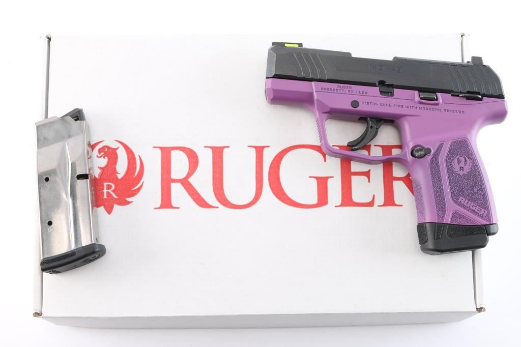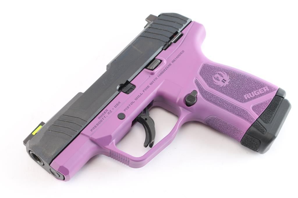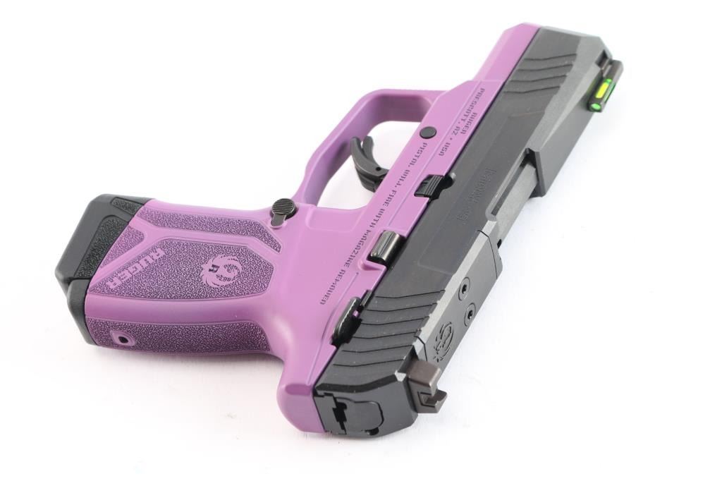 American made striker-fired semi-automatic compact pistol chambered in 9x19mm. Features a black oxide finished slide with fore/aft cocking serrations and optics cut, 3.2" cold hammer forged barrel, dovetailed trituim/green fiber optic front sight, dovetailed square notch rear sight, bladed trigger safety, thumb safety on the left side of the frame, reversible push button magazine release and durable purple colored glass-filled nylon frame with stippled grip w/Ruger name and logo. Bore is pristine and the polymer is excellent. Pistol exhibits minor oxidation on the barrel hood with no other observed wear. Action is crisp. Comes with two 10rd magazines, one with finger extension, manual and factory box. Condition is NRA very good. ***Modern Firearm***.