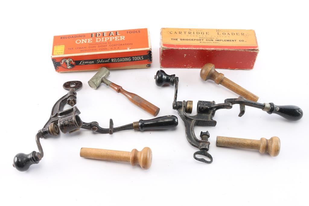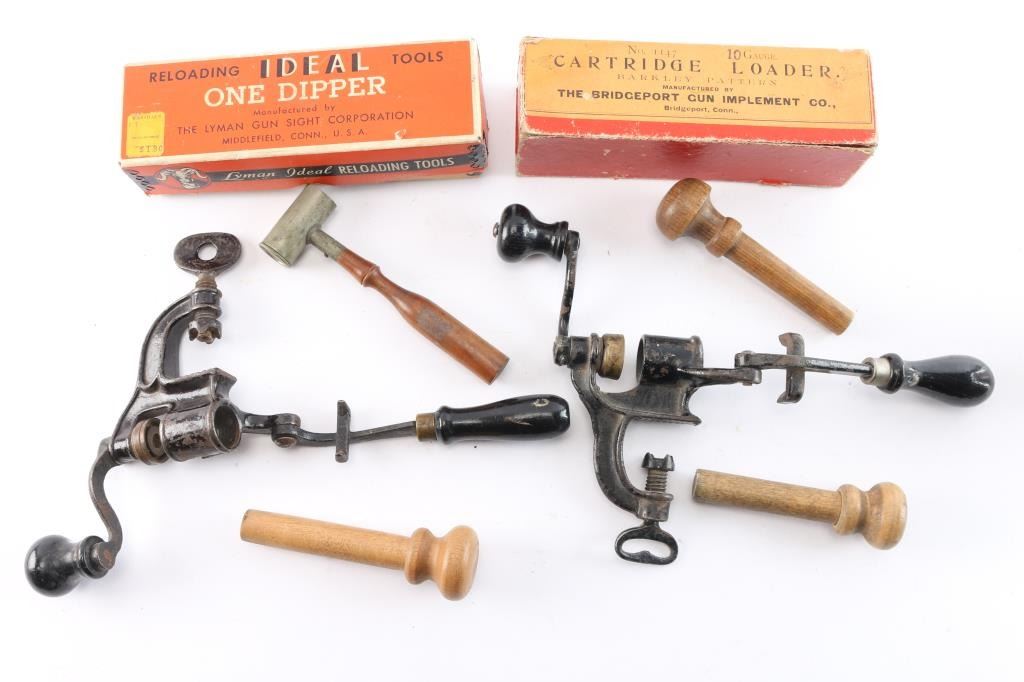 (A) Ideal by Lyman "Dipper" for lead bullet casting. Mint in box, never assembled in wax paper. (B) Bridgeport Gun & Implement Co. (Successor to Sharps Rifle Co) 10 GA cartridge loader. In brass with wood and brass tamper. V.G condition with good picture label. (C) 2 antique shotgun cartridge reloaders from 19th century. Both good. (D) 4 misc. loading accessories in fair to good condition.
