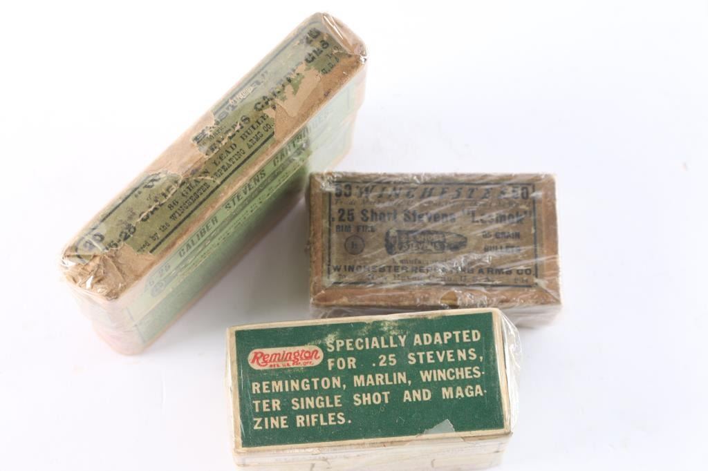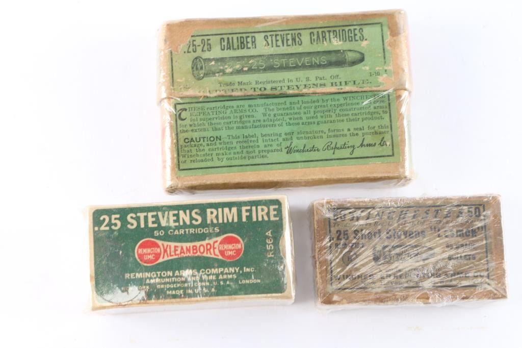 (A) .25-25 Stevens by Winchester. Opened full box with cartridge illustration on side. Good but top label tattered badly and mostly gone. (B) .25 Stevens rimfire by Remington UMC. Opened full box. Good to V.G. (C) .25 Short Stevens by Winchester with cartridge Illustration on top. Opened full box. "Lesnok". Good condition with staining, fading and normal aging.
