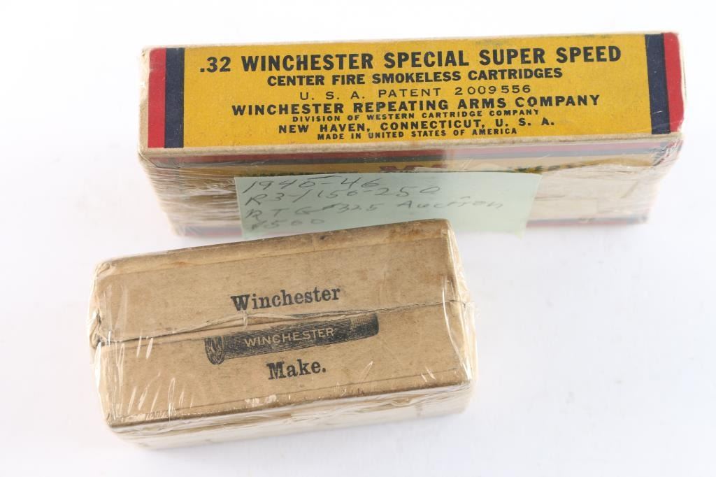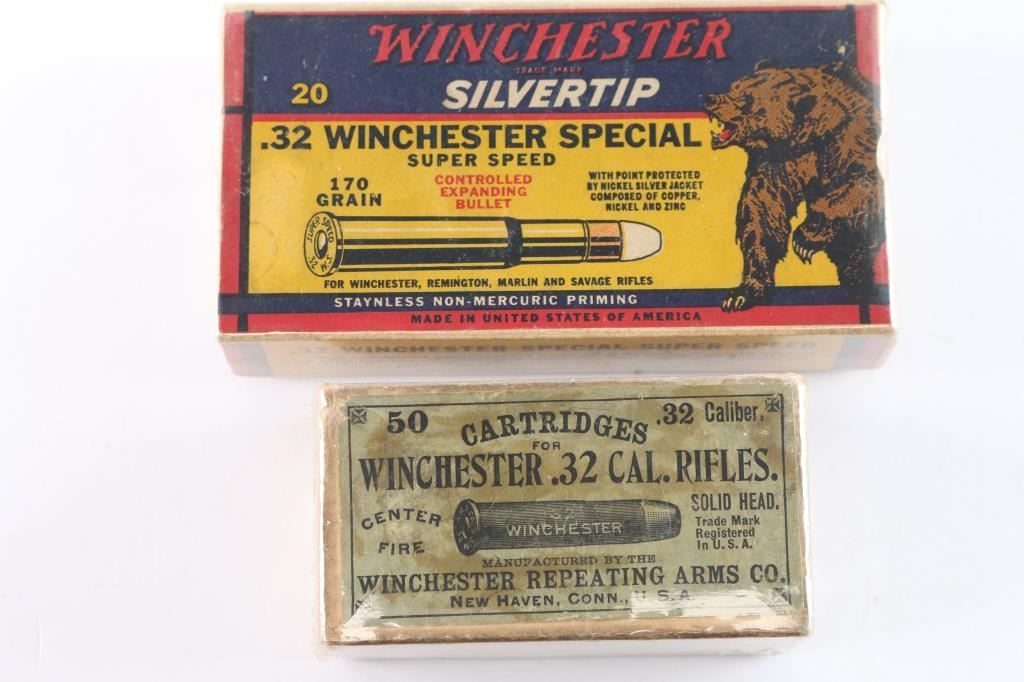 (A) Winchester .32 (.32-20) marked Winchester Model 1873 on end with cartridge illustration. Green label. Good condition. (B) .32 Winchester Spl Super Speed 170gr. Bear illustration. In very good condition.