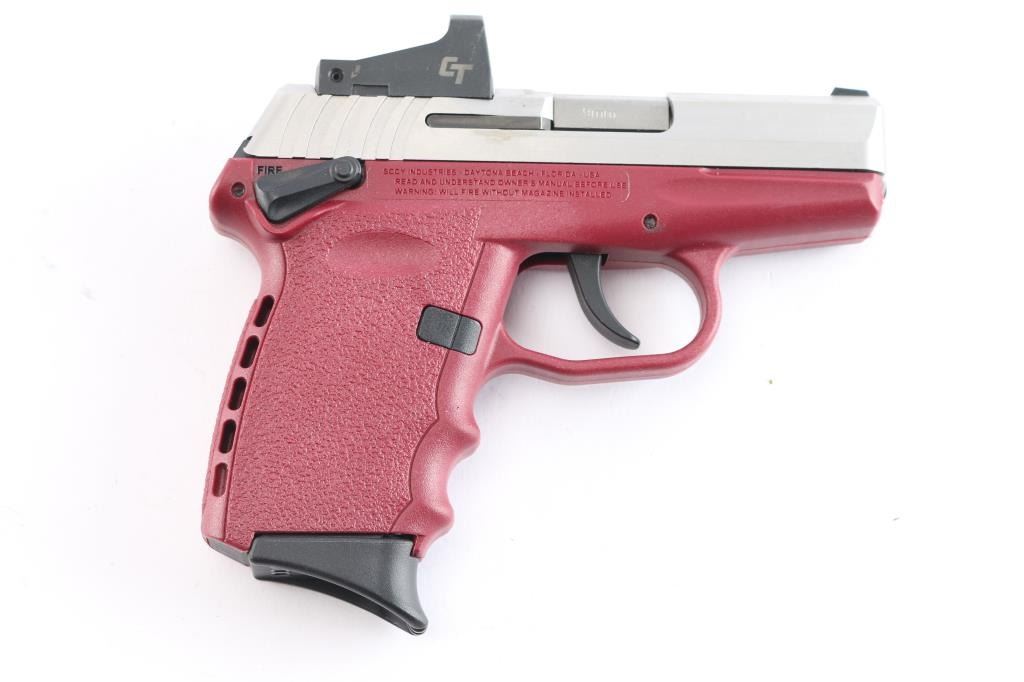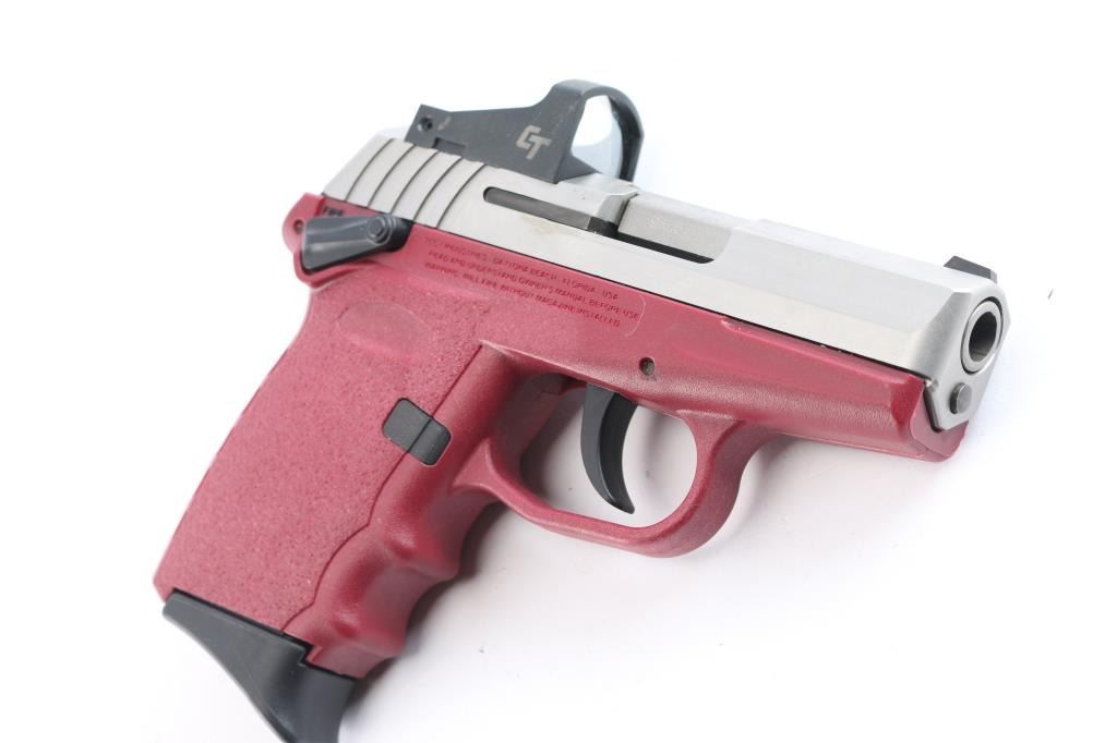 Made in USA. Compact, semi-automatic pistol chambered in 9mm. Features a 3" barrel, satin stainless steel slide, maroon colored polymer frame, internal hammer, one front white dot sight, mounted Crimson Trace 5 MOA red dot sight w/cover and integral rear sight , smooth trigger, ambidextrous manual thumb safety on frame, slide stop, push button magazine release. Bore is very good with strong rifling/slightly dirty. Retains approx. 99% finish with minor handling marks. Includes two 10rd magazines, factory cardboard box, manual and trigger lock. Condition is NRA excellent. ***Modern Firearm***.