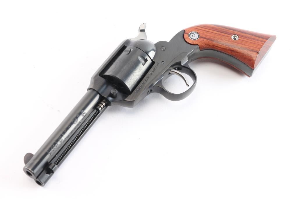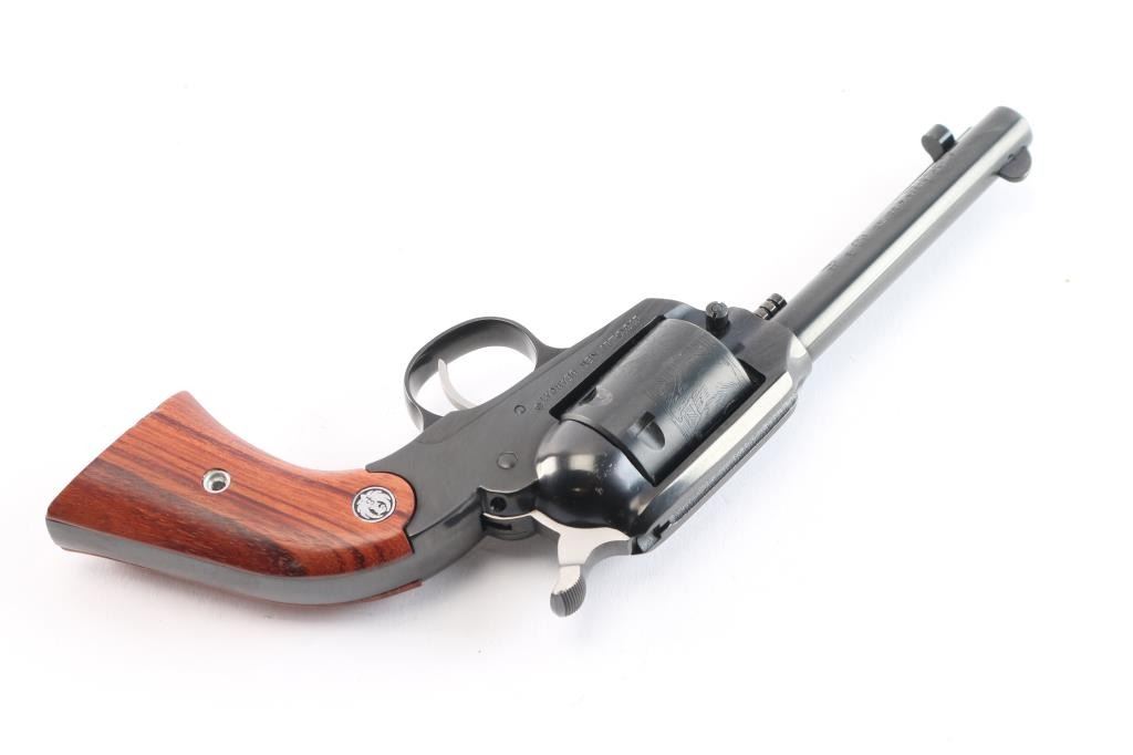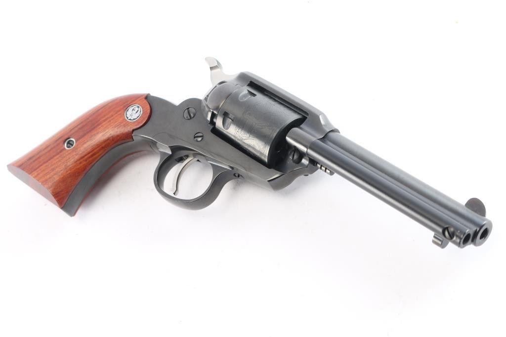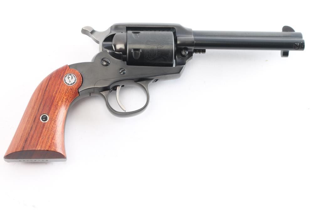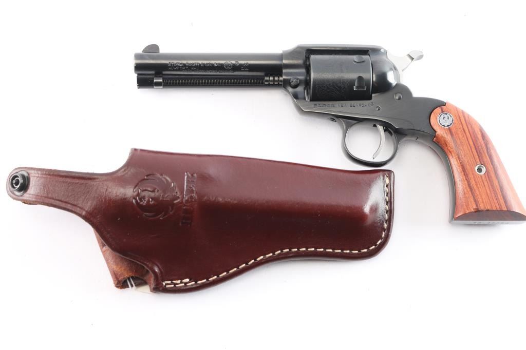 American made Single Action 6-Shot Revolver chambered for .22 caliber ammuntion and comes with a factory engraved .22LR cylinder. Features a blued finish, 4" barrel, blade front sight, integral square notch rear sight, serrated polished hammer spur, smooth curved trigger and two piece smooth wood grips with Ruger medallions. Retains approx. 98% finish with a little scrape on the left recoil shield, blemishes on the front of the ejector rod housing and minor holster wear. Wood grips are fine. Bore is excellent. Comes with Ruger dark brown leather holster.