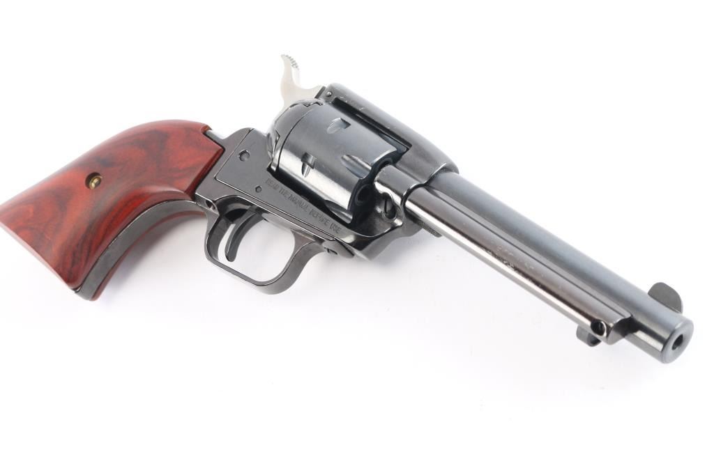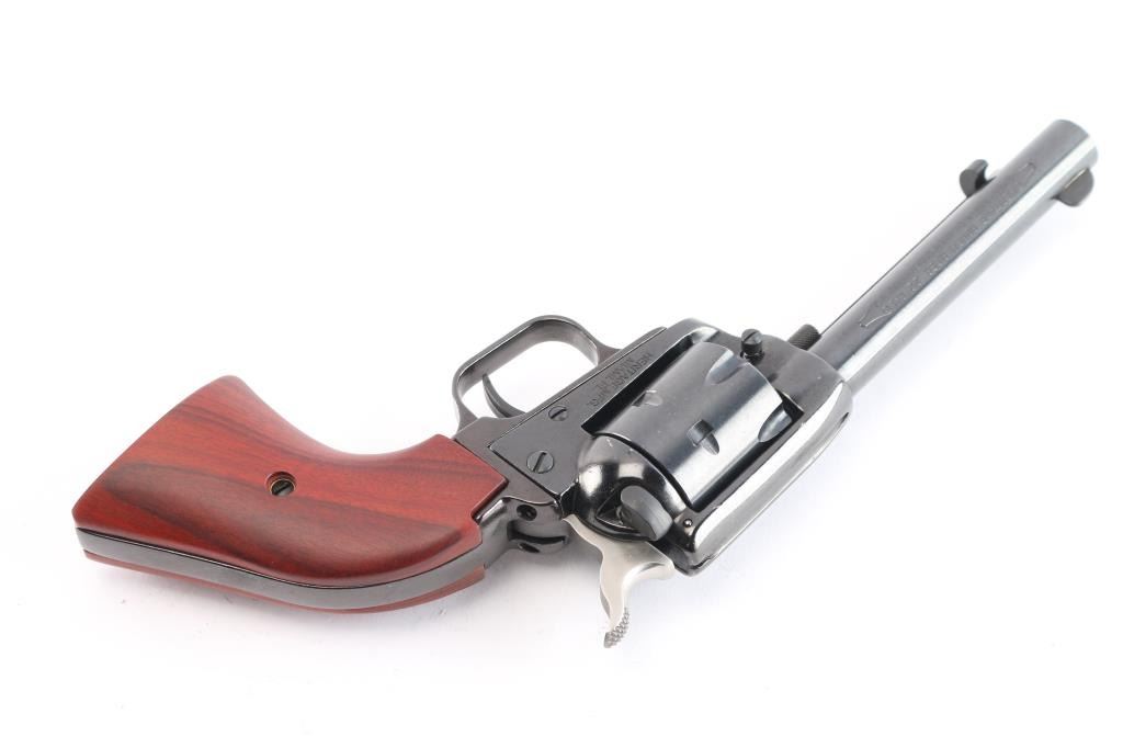 American made Single Action 6-Shot Revolver chambered for .22 caliber ammuntion and comes with fluted .22LR cylinder. Features a black oxide finish, 4.8" barrel and frame, fixed blade front sight, integral square notched rear sight, safety on the left side of the hammer with checkered trigger spur and two piece Cocobolo grips. Retains 95% finish with scattered scratches. Wood grips are fine. Bore looks very good/slightly dirty. Condition is NRA very good. ***Modern Firearm***.